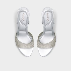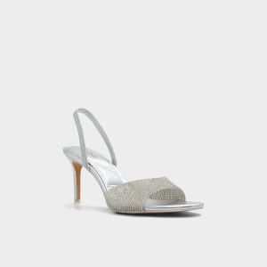 A classic sling back silhouette lends sophisticated appeal to these elegant nude heeled sandals.