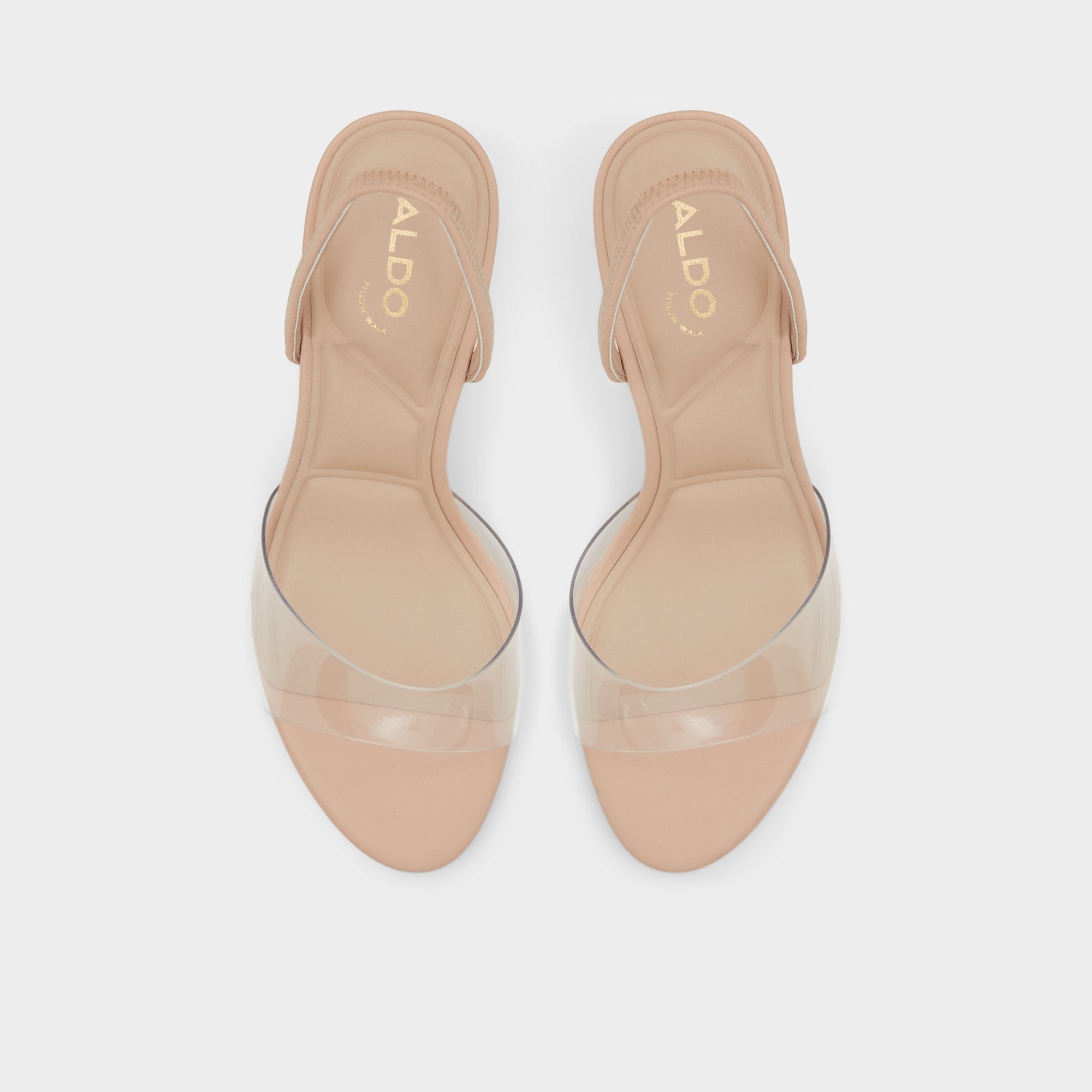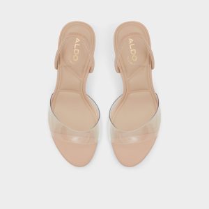 A classic sling back silhouette lends sophisticated appeal to these elegant nude heeled sandals.