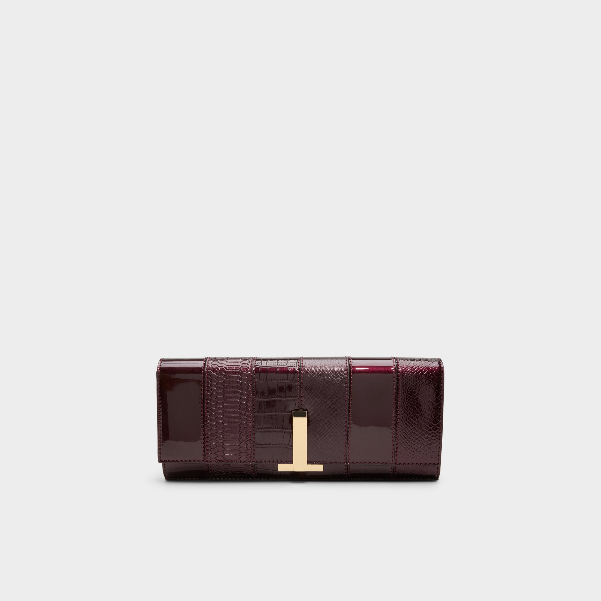 Glossy wine-tone patent leather combines croc, lizard, and smooth panels into a sleek patchwork finished with a minimalist gold bar clasp, creating a clutch that catches gallery lights and camera flashes. Clutch it against a satin slip for rooftop cocktails or tuck it under a tailored jumpsuit at wedding receptions to complete any look.