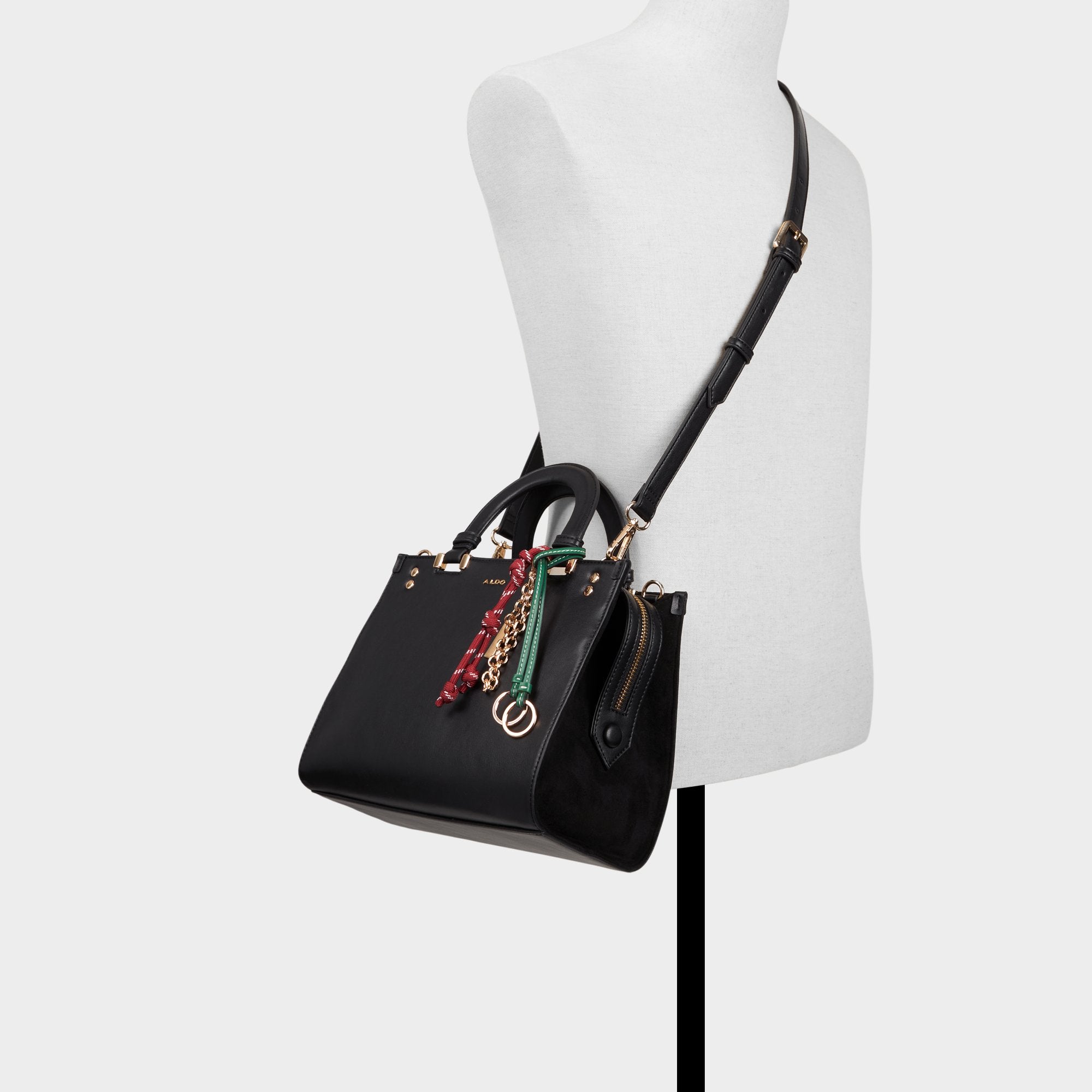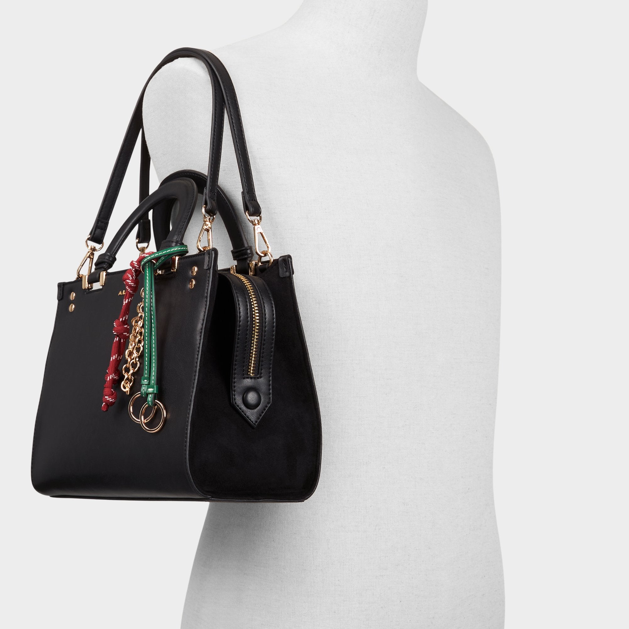 Sleek black leather frames a squared silhouette, with a knotted tassel-and-chain charm adding a bold focal point, while a convertible carry shifts from top-handle to cross-body with one easy snap. Carry it with tailored separates for coffee runs, or sling it over slip dresses on date nights, finishing looks with sleek confidence.
