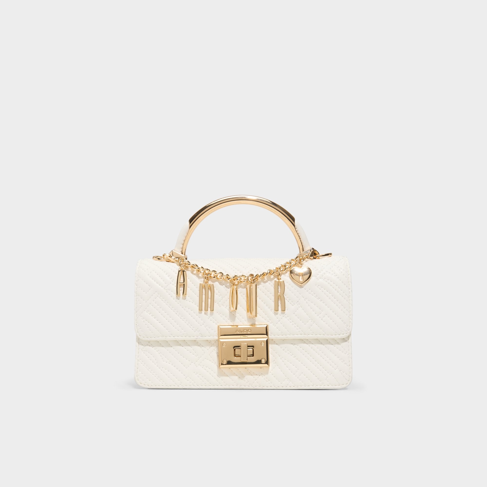 Mini but mighty, this quilted white body pairs with a sleek gold arc handle and a lettered AMOUR chain that adds jewelry vibes while guarding essentials, turning everyday moments into a touch of purse-sized luxe. Carry it with a slip dress for soirees or tuck it under a blazer for brunch dates to finish the look.