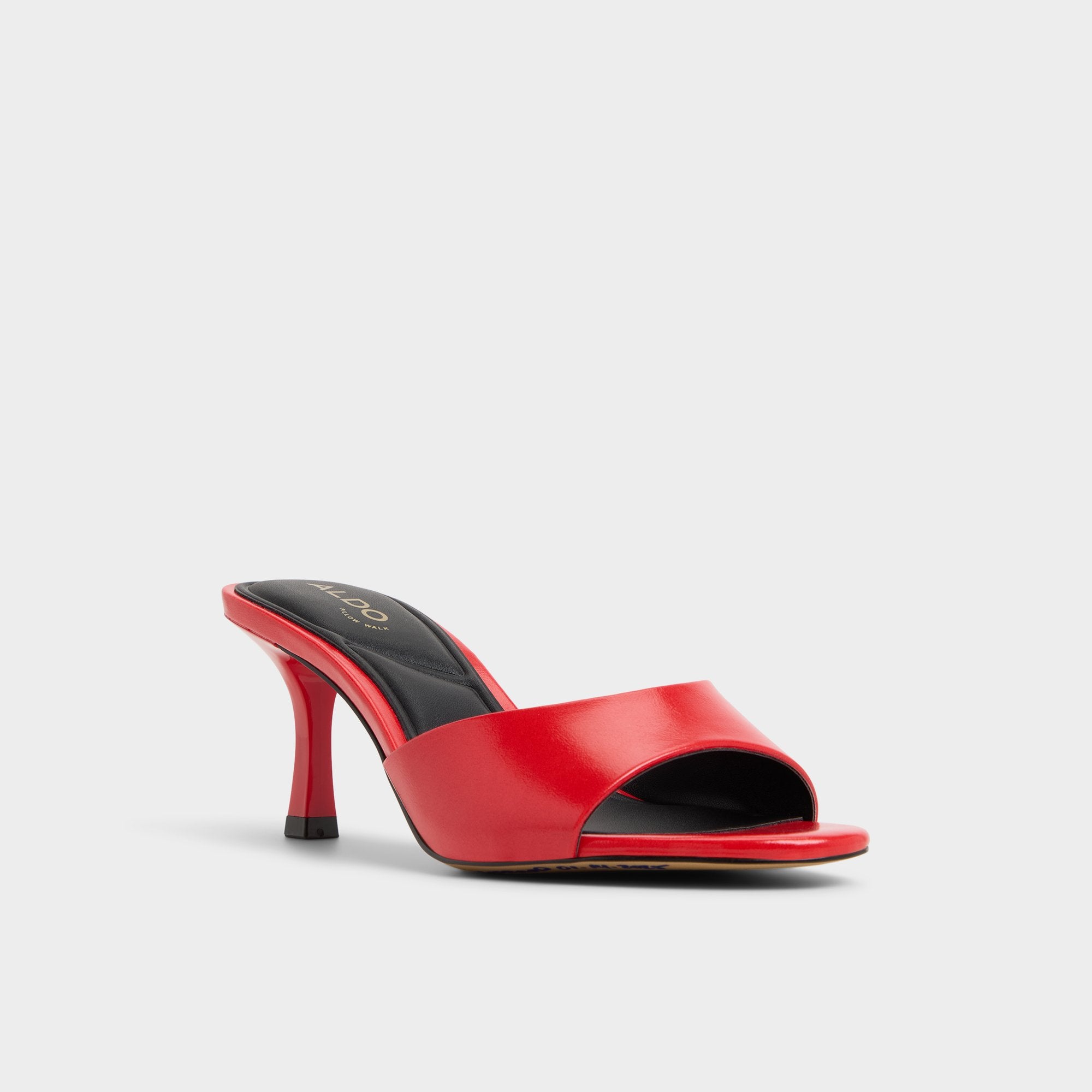 Fire-red leather curves across the foot, meeting a cushioned square footbed and a poised stiletto heel that turns each step into a confident flicker of energy. Pair with cropped suiting for gallery openings, or slide on with a slinky slip dress when late-night tapas calls for effortless allure.