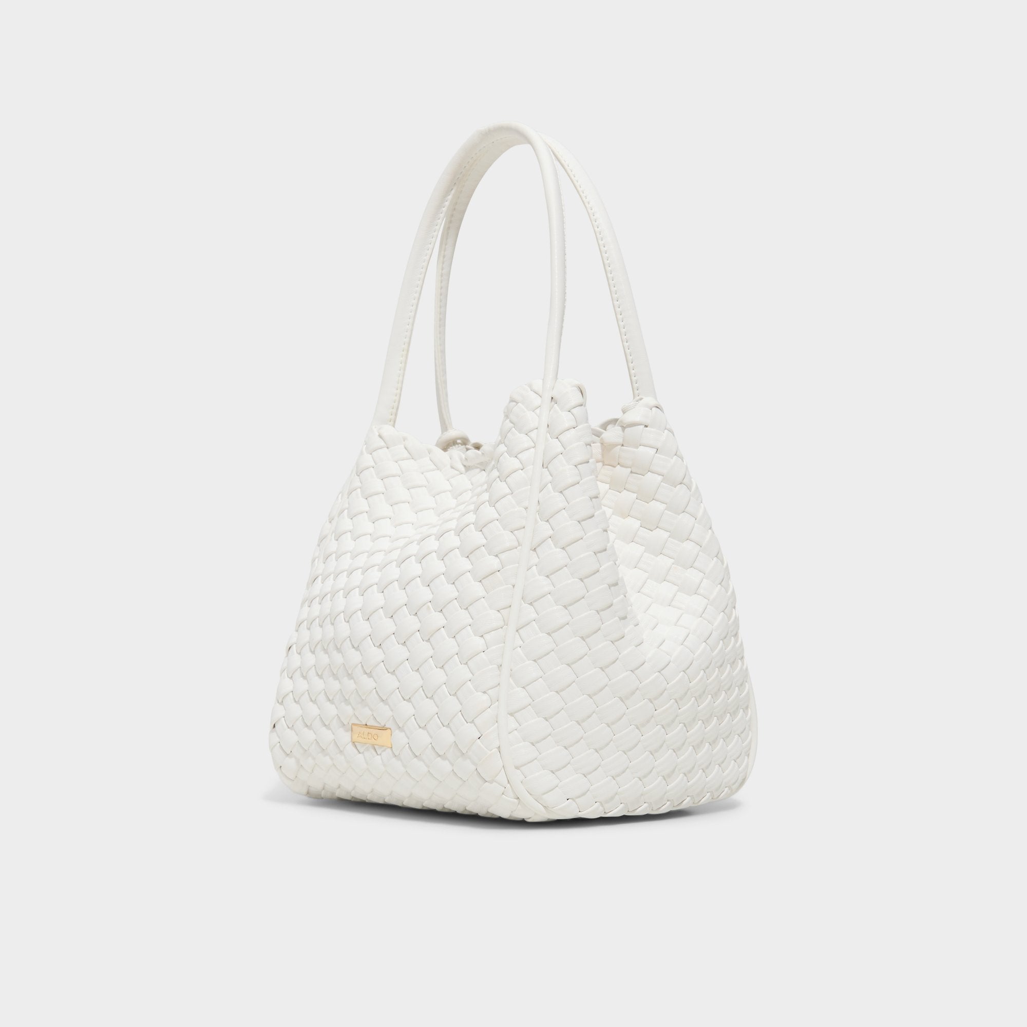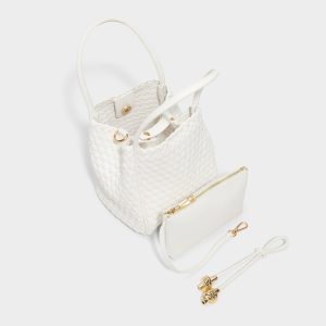 Hand-woven white leather creates a cloud-soft, sculptural bag with a cinch drawstring, gleaming knot tassels, and a relaxed polish that makes everyday moments feel sunlit—perfect for days that dream up floral midi brunch wanderings. Carry it with a floral midi for brunch dates, or sling it with linen shorts for sunlit strolls, letting the texture seal the look.