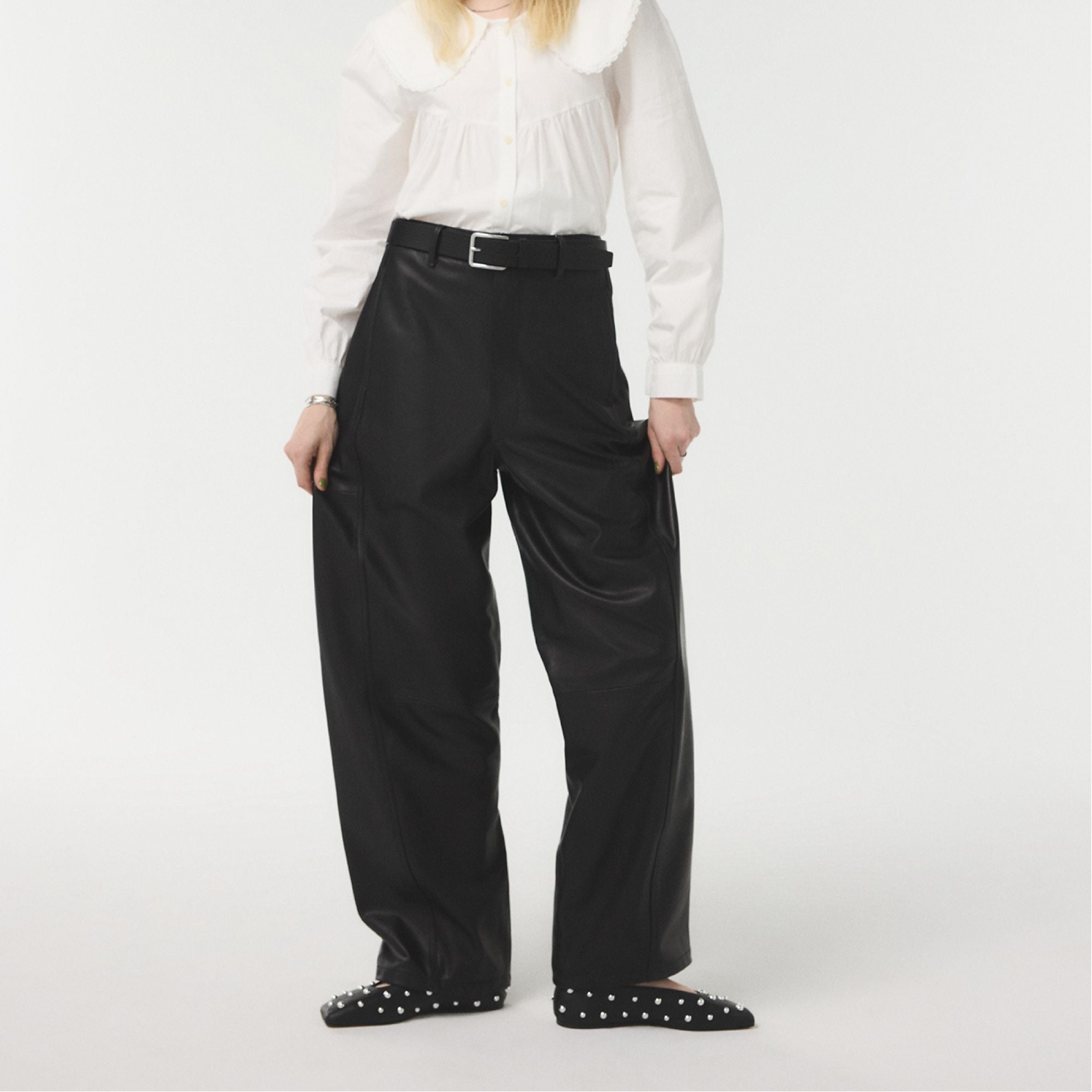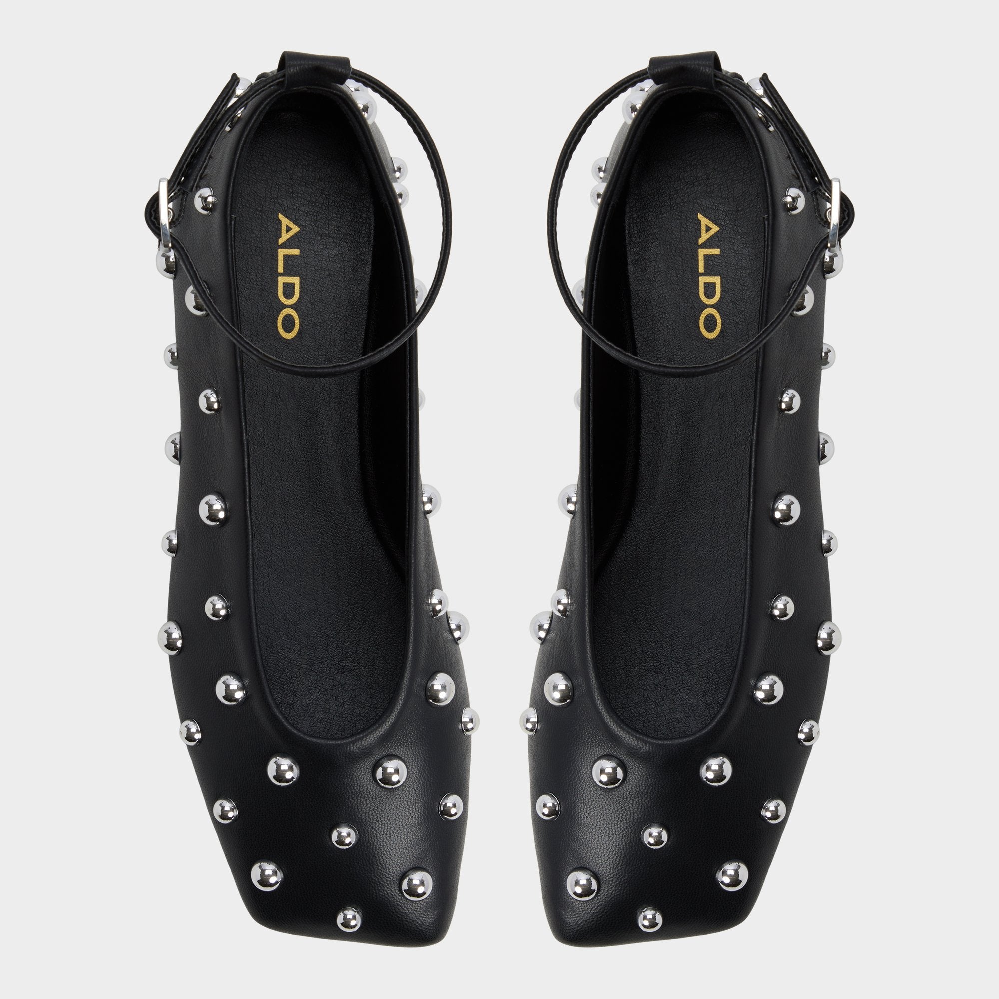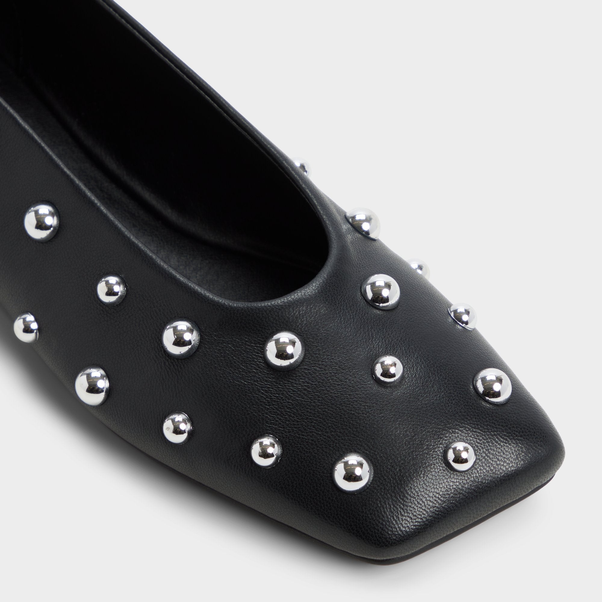 Polished metal studs crown this ankle-strap ballet flat, a sleek counterpoint to smooth black leather, giving an edge that reads rebellious yet polished for days that flow from desk to dinner. Pair with cropped tailored trousers for office brainstorms, or slip under a dress when gigs call.