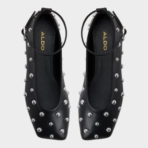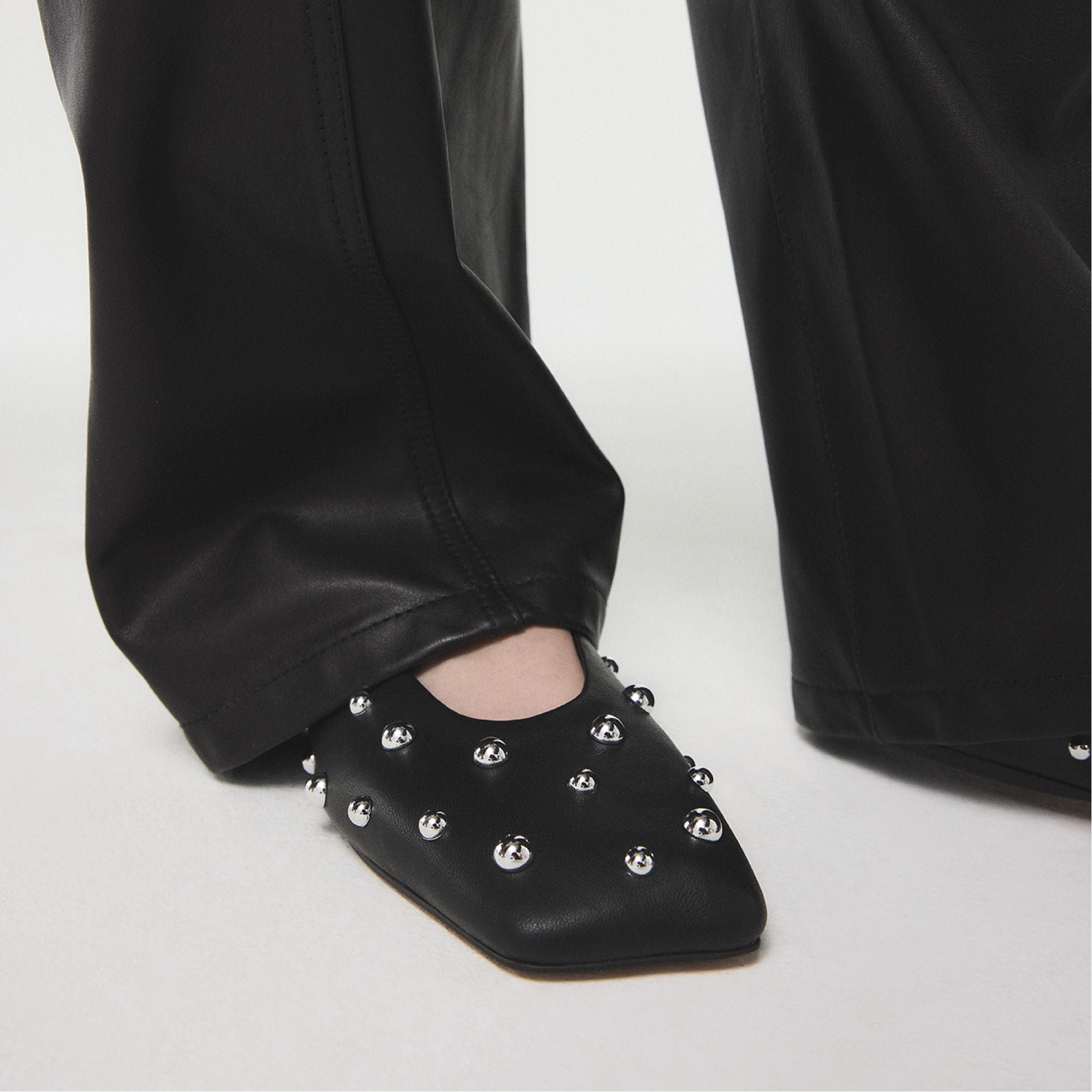 Polished metal studs crown this ankle-strap ballet flat, a sleek counterpoint to smooth black leather, giving an edge that reads rebellious yet polished for days that flow from desk to dinner. Pair with cropped tailored trousers for office brainstorms, or slip under a dress when gigs call.