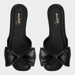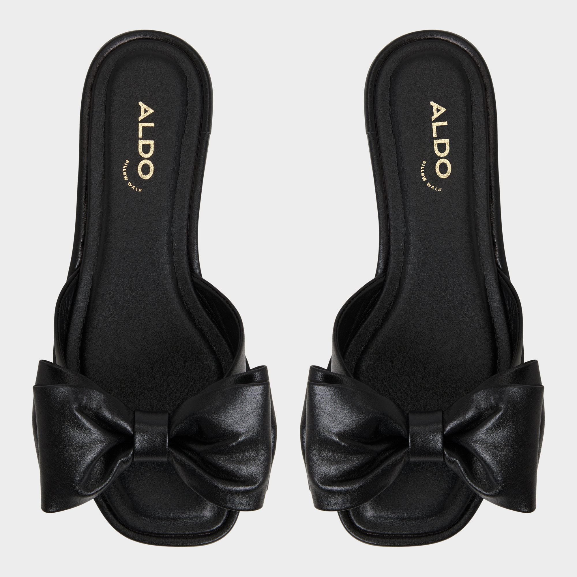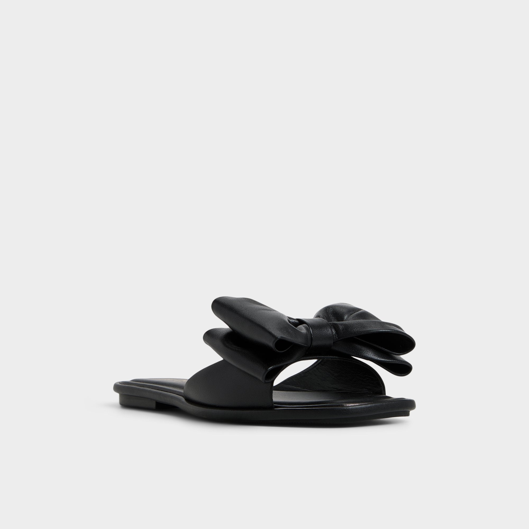 Sculptural leather bow folds like midnight origami across a sleek slide, elevating the look with a touch of after-hours polish, while a cushioned footbed keeps every casual stride comfortable from morning errands to evening streets. Pair with cut-off shorts for market detours, or swap in a satin slip skirt for seaside dinners and moonlit strolls.