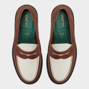 Cream-topped vamp meets brown leather, giving penny loafers a fresh spin on a classic style with subtle texture, easy steps, and wearable polish for daily moments. Team them with cropped navy chinos for art openings, or pair with raw denim for patio drinks after sunset, adding versatile charm to any city errand or evening hang.