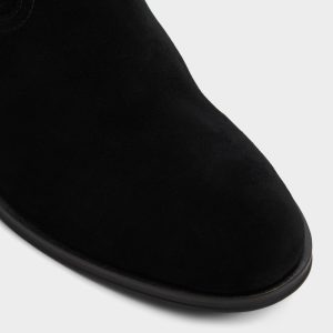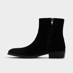 Velvety black suede shapes this sleek ankle boot, featuring a hidden side zip for quick exit and a low block heel that maintains a sharp silhouette from office days to night outings. Pair with slim charcoal denim for gallery trips or tuck under a tailored suit-the suede effortlessly balances the formal look.