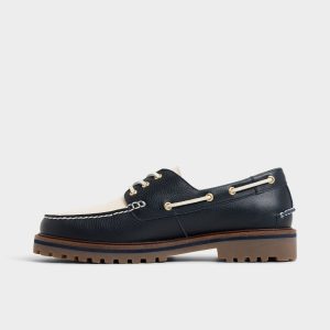 Pebbled navy leather sets the boat shoe apart, with deep-cut lug soles and metal eyelets that fuse rugged function with city-ready polish, while a supple, full-grain upper keeps comfort steady from dockside to downtown. Team it with cuffed chinos for seaside brunches or anchor faded jeans for road trips, the tread grips wet decks and city pavements.