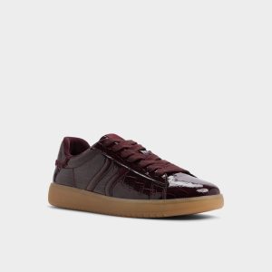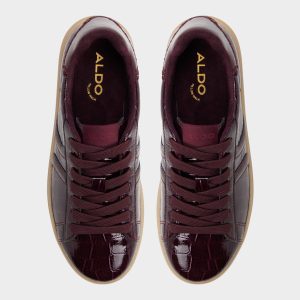 Glossy burgundy croc embossing turns the retro cup-sole sneaker into eye-catching allure while soft padding and gum outsole cushion steps as you move from coffee queues to off-duty explorations. Pair wide-leg denim for playlist-powered errands or ground it under satin slip skirts at rooftop art shows.
