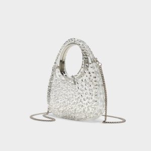 Cinderella’s glass slipper just found her match. Channel the glamour of fairytale style in this transluscent structured top handle bag. With a dainty shoulder strap and all-over gemstones, all the guests of the ball will do a double take.