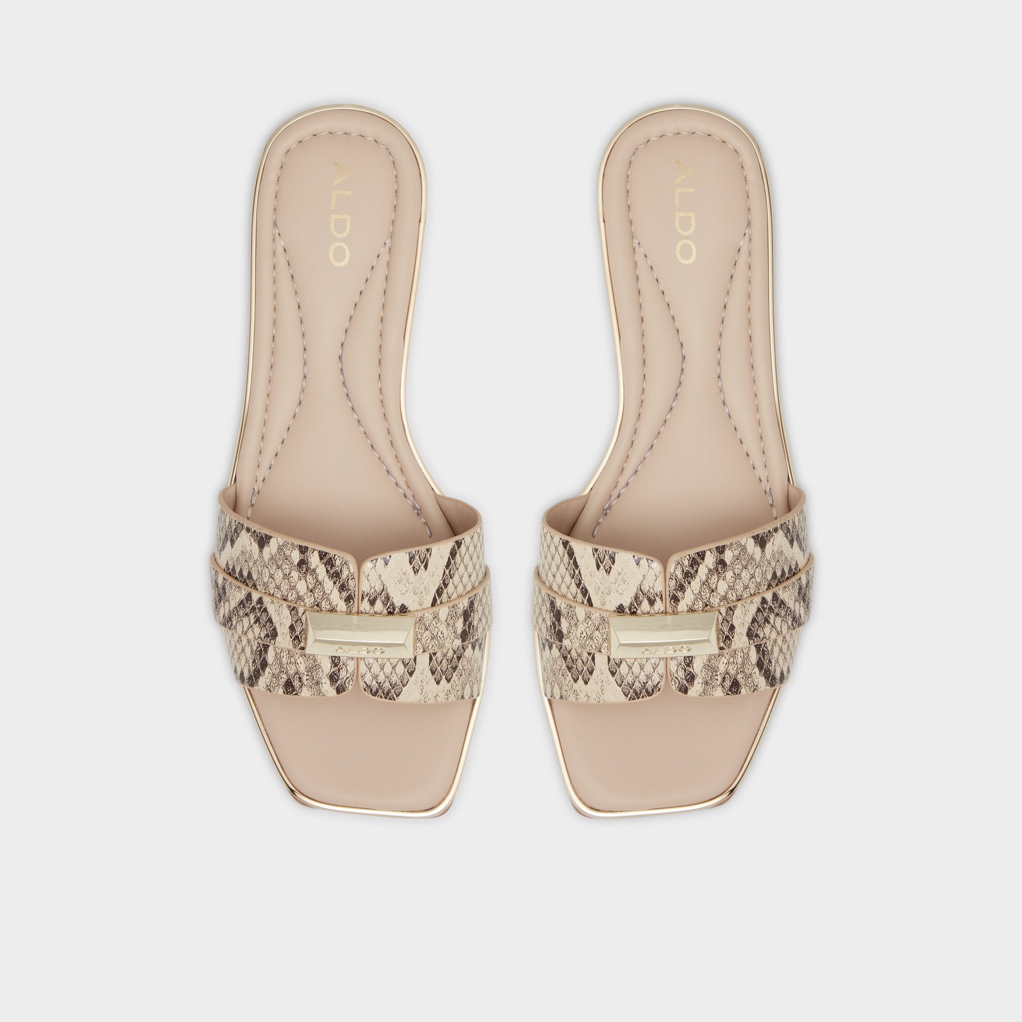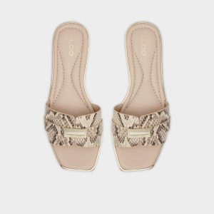 Snakeskin-patterned bands wrap the slide in untamed polish, their subtle gold gleam catching the city light, while flexible flat soles keep every step easy from sidewalk chatter to brunch lines. Pair with linen cropped pants for markets, or slip them under a satin midi when patio cocktails turn into starlit strolls.