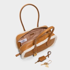Plush shearling edges frame a sleek rectangular shoulder bag, where caramel leathers meet a swingy padlock charm—an elevated detail that folds into your day, turning cold-weather errands into luxe city-chic moments. Carry it with a wool coat for evening strolls or sling it with a knit dress for coffee runs, finishing the look with polished luxury.