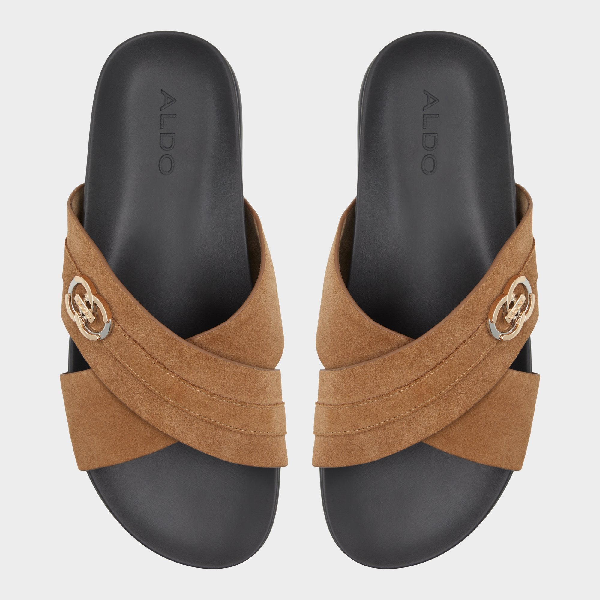Who said slides had to be boring? These easy on, easy off sandals certainly aren’t courtesy of a chic metal ornament and a criss-cross design.