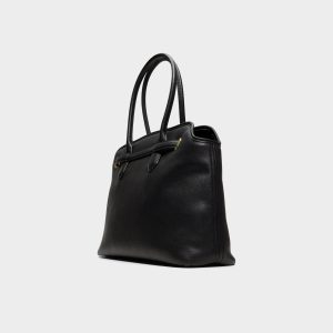 Supple black leather blends tailored polish in this streamlined tote, cinched by a belt-inspired strap and gold buckle hinting at structure while making daily errands feel intentional. Carry it with sleek suits for client meetings or sling it over knit sets on weekend errands to complete the look.