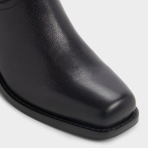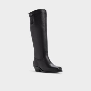 Supple black leather climbs to the knee in pull-on style, shaping a sleek silhouette that moves with you, while a low angled heel adds western flair to city walks, platform waits, and after-dark wanderings. Pair with tailored coats for boardroom polish, or layer over denim and trenches for weekend markets.