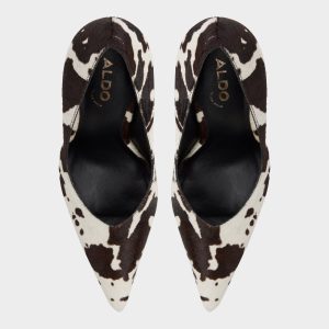 Wild cow-print faux fur wraps this sharp point-toe pump, and the jet-black stiletto boosts you skyward with runway composure, while smooth leather lining keeps struts feeling like secrets. Pair with crisp trousers for power pitches, or swap under a satin slip when gallery openings stretch toward midnight.