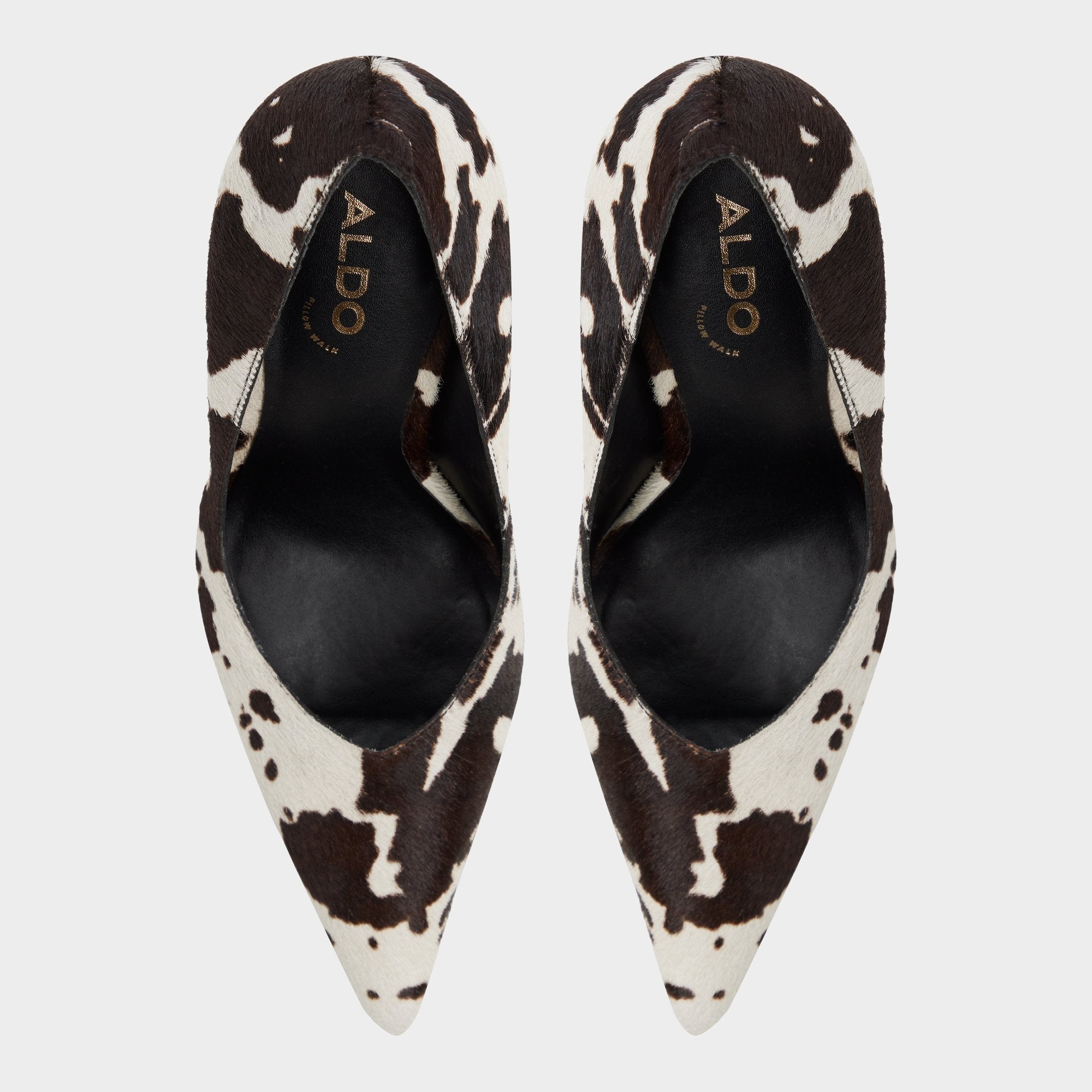 Wild cow-print faux fur wraps this sharp point-toe pump, and the jet-black stiletto boosts you skyward with runway composure, while smooth leather lining keeps struts feeling like secrets. Pair with crisp trousers for power pitches, or swap under a satin slip when gallery openings stretch toward midnight.