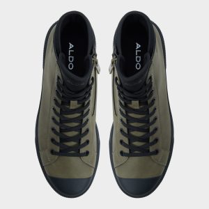 Raised rubber toe cap and matte olive leather give this high-top a street-ready edge, while a cushioned cup sole and metal eyelets keep the ride flexible from subway steps to late-night loops around town. Anchor tapered joggers for casual Fridays or roll with cuffed denim and a bomber for impromptu gig nights.
