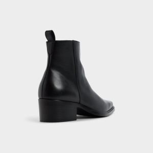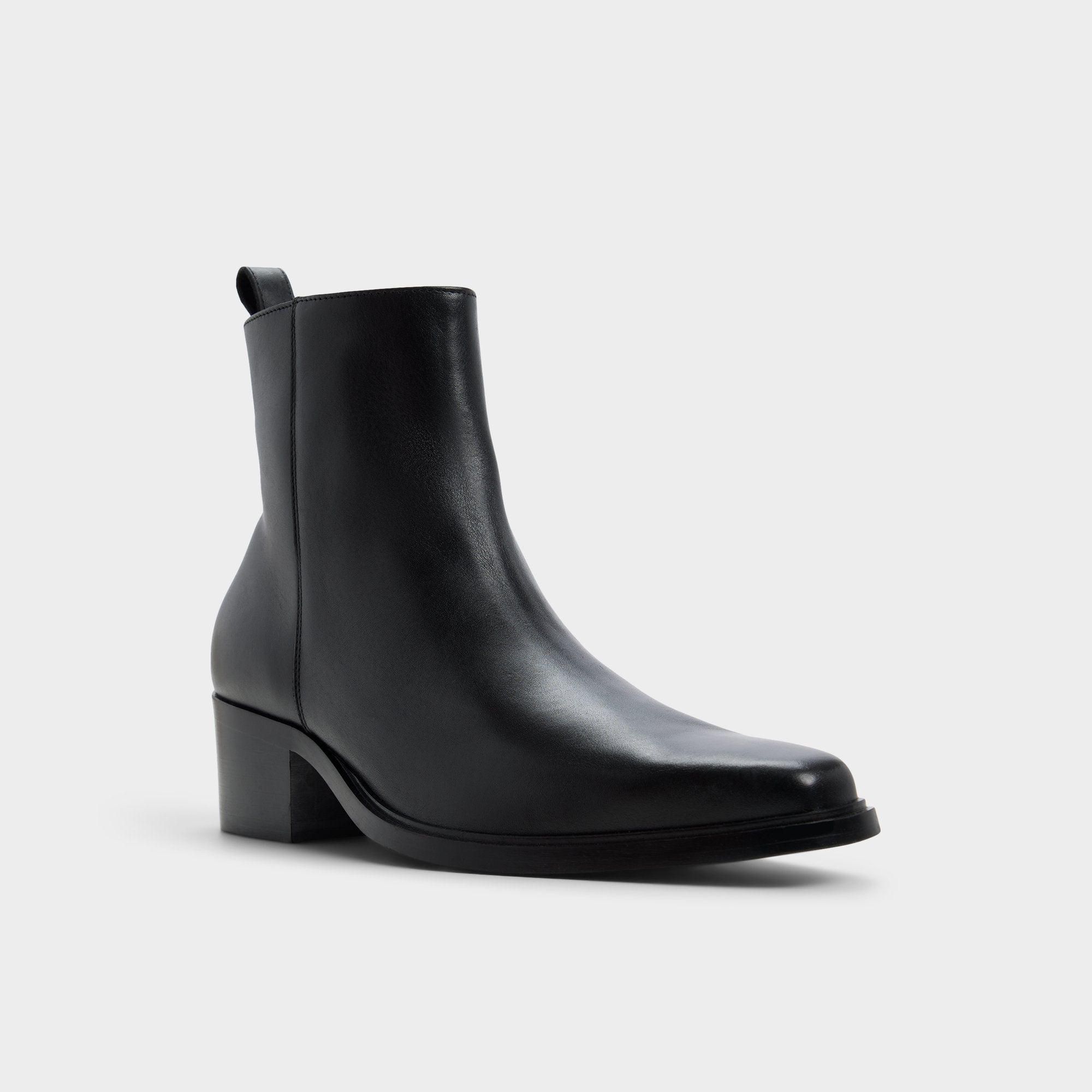 Sleek black leather meets a confident block heel on this ankle boot, with a clean almond toe and discreet side zip adding height and quick entry from early commutes to last call. Anchor slim charcoal denim for art-show drinks or sharpen a wool suit at Monday meetings-the subtle shine keeps every fit on point.