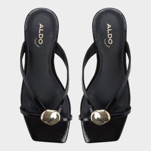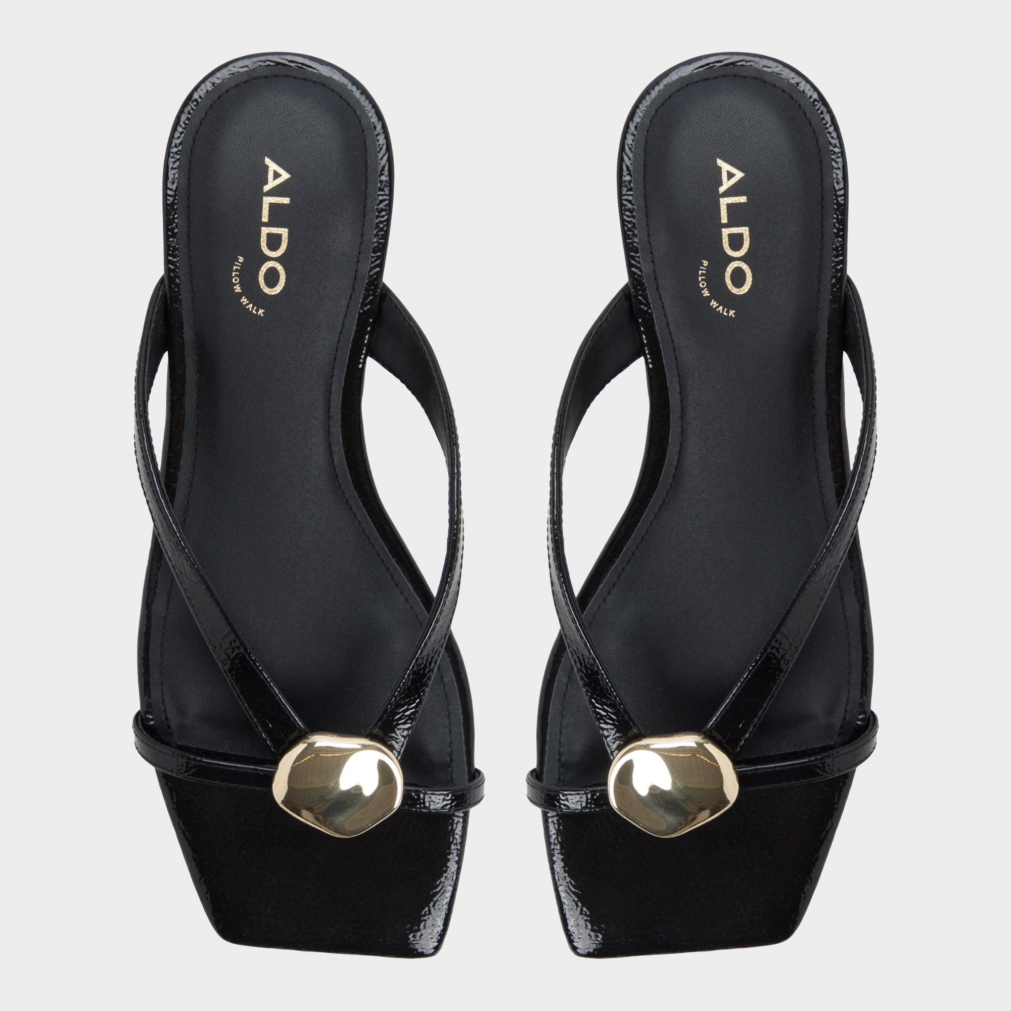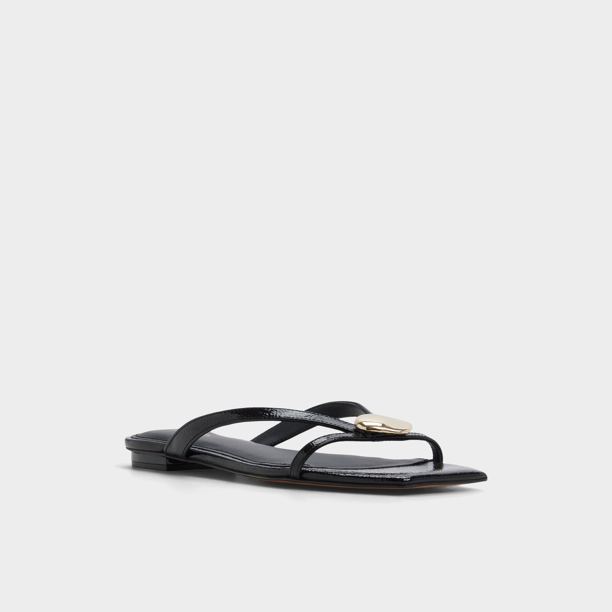 Glossy patent leather catches light, a gold-accent thong strap set against a cushioned, walk-ready footbed that makes every brunch-to-sunset stroll feel effortlessly cool for city errands and seaside sidewalks alike. Pair with cutoffs for market mornings, or slip under a slip dress as rooftop cocktails call.