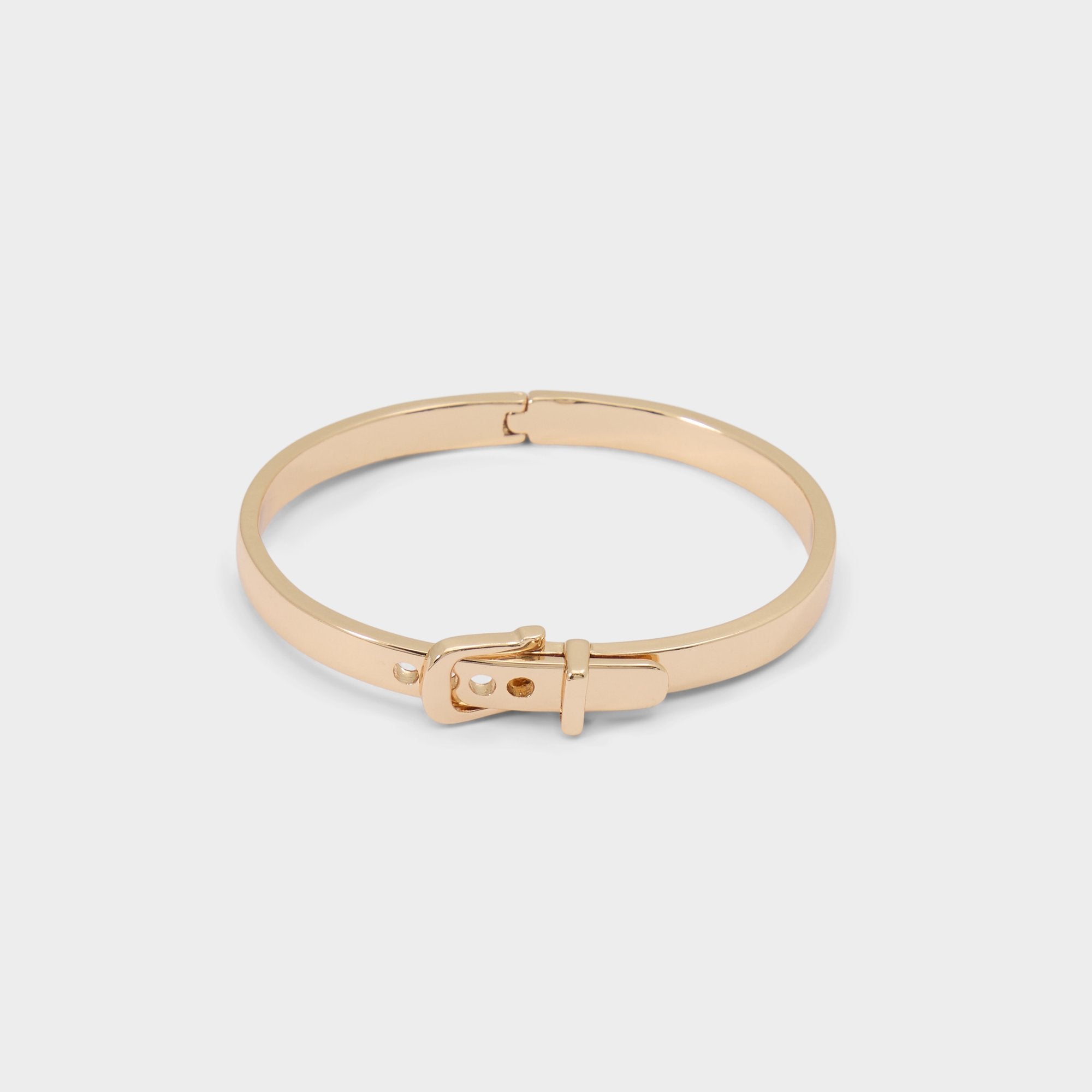 Polished like liquid gold, the slim bangle wraps the wrist in an arc and locks with a belt-buckle clasp adding subtle edge and secure closure. Stack it beside a classic watch for presentation days or let it solo with satin cami at rooftop drinks.