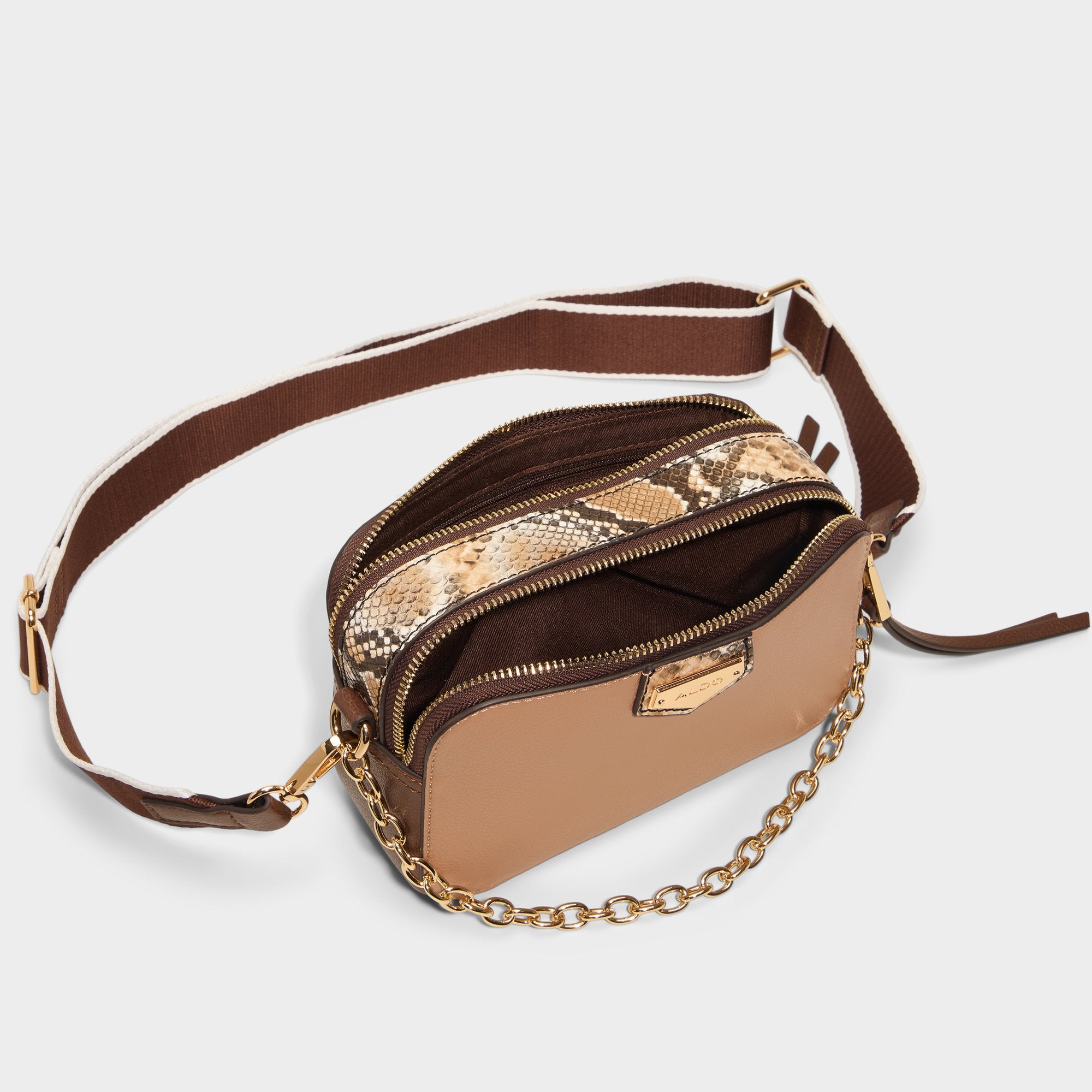 Striped webbing meets a gold chain on this pebble-grain camera bag, with clip-off straps changing its vibe instantly while a zip top keeps essentials secure. Sling it with high-waist jeans for coffee runs, or switch to the chain and tuck it against a slip dress at golden-hour dinners.