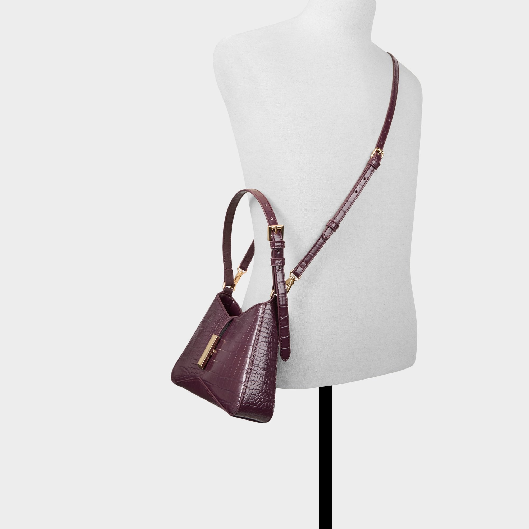 Deep burgundy croc-emboss shapes this sleek shoulder bag, with a sculpted V front and polished gold bar that snaps closed effortlessly for after-dark confidence. Sling it over a satin cami and jeans for rooftop drinks or tuck it under a blazer at gallery nights to seal the look.