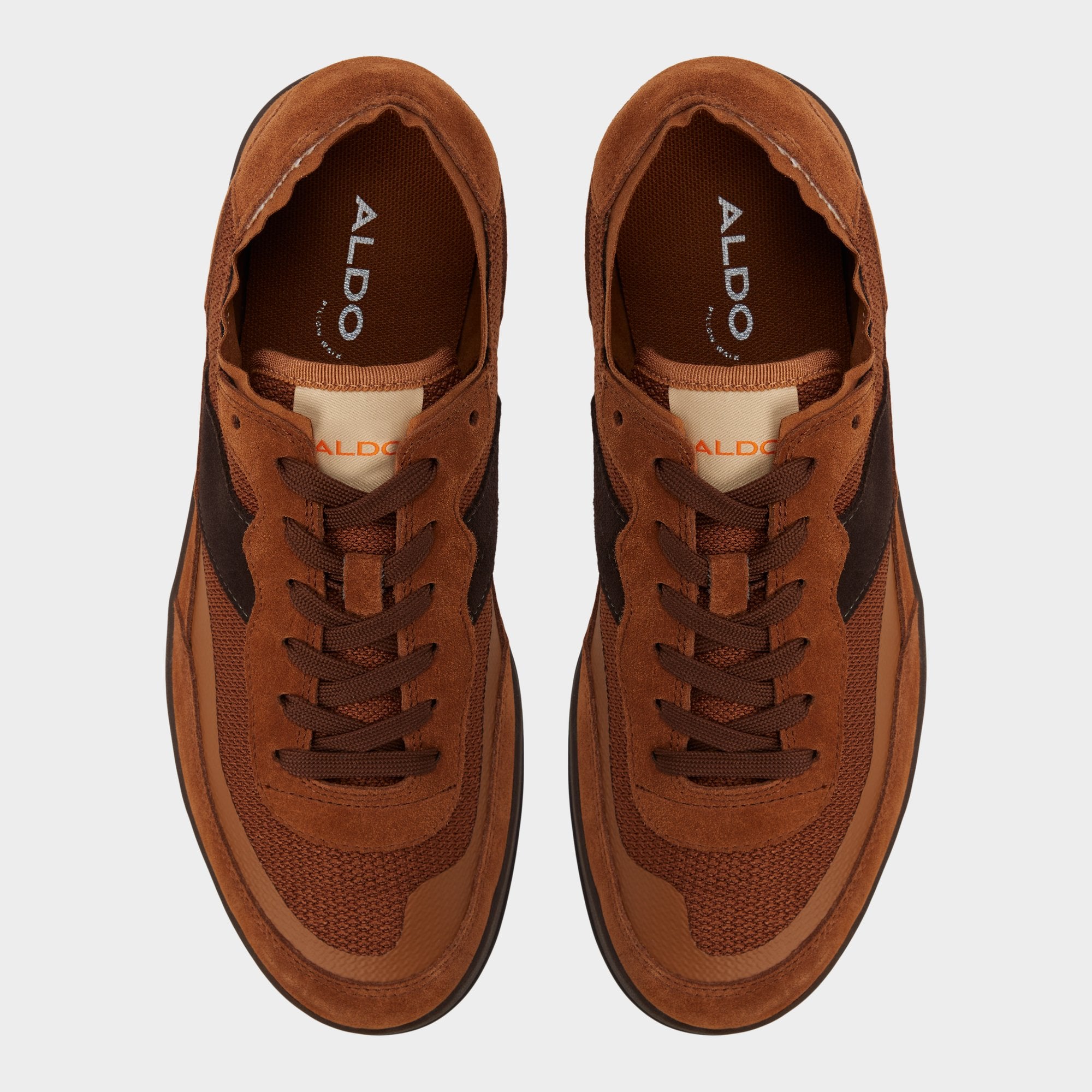 Burnt caramel suede contrasts with mesh panels for an edge, while a lugged jogger sole cushions every step and lets you roll from city streets to trail paths. Pair with cuffed cargo pants for weekend market strolls, or team with slim sweatpants for late-night flights.
