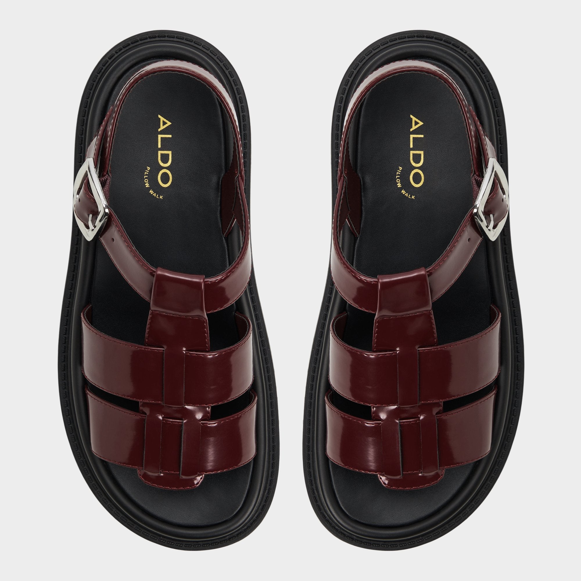 Glossy patent straps form a modern fisherman cage, and a chunky lug sole underfoot adds just-enough lift plus city-ready grip, letting you wander from waterfront paths to record shops without second thoughts. Pair with cropped cargo pants for flea-market mornings, or ground a satin slip skirt when rooftop gigs run past sunset.