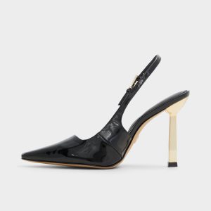 Liquid-black patent wraps a bold after-dark silhouette, where sculpted mirror-gold stilettos catch light and promise instant confidence as you glide from lobby tiles to late-night taxis through neon nights and crowded streets. Pair with sleek trousers for gallery openings, or swap in a satin midi for rooftop cocktails and city-date nights.