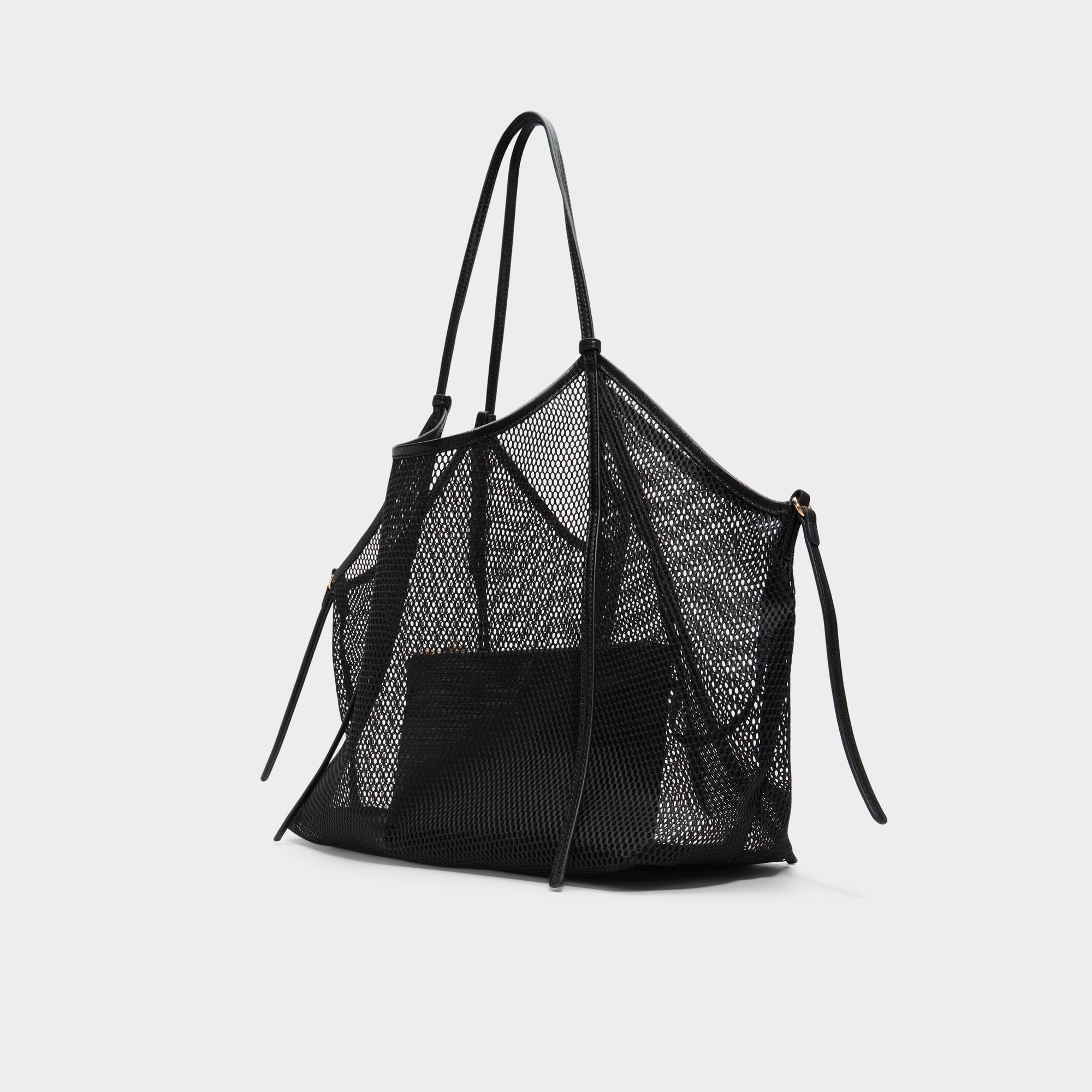 Open-air mesh gives this roomy tote a sporty twist, its clean black lines and gold rings keeping items in view yet light to carry. Pair it with a cropped tank and bike shorts to spin class, or sling it beside a sundress for poolside hangs.