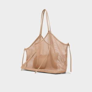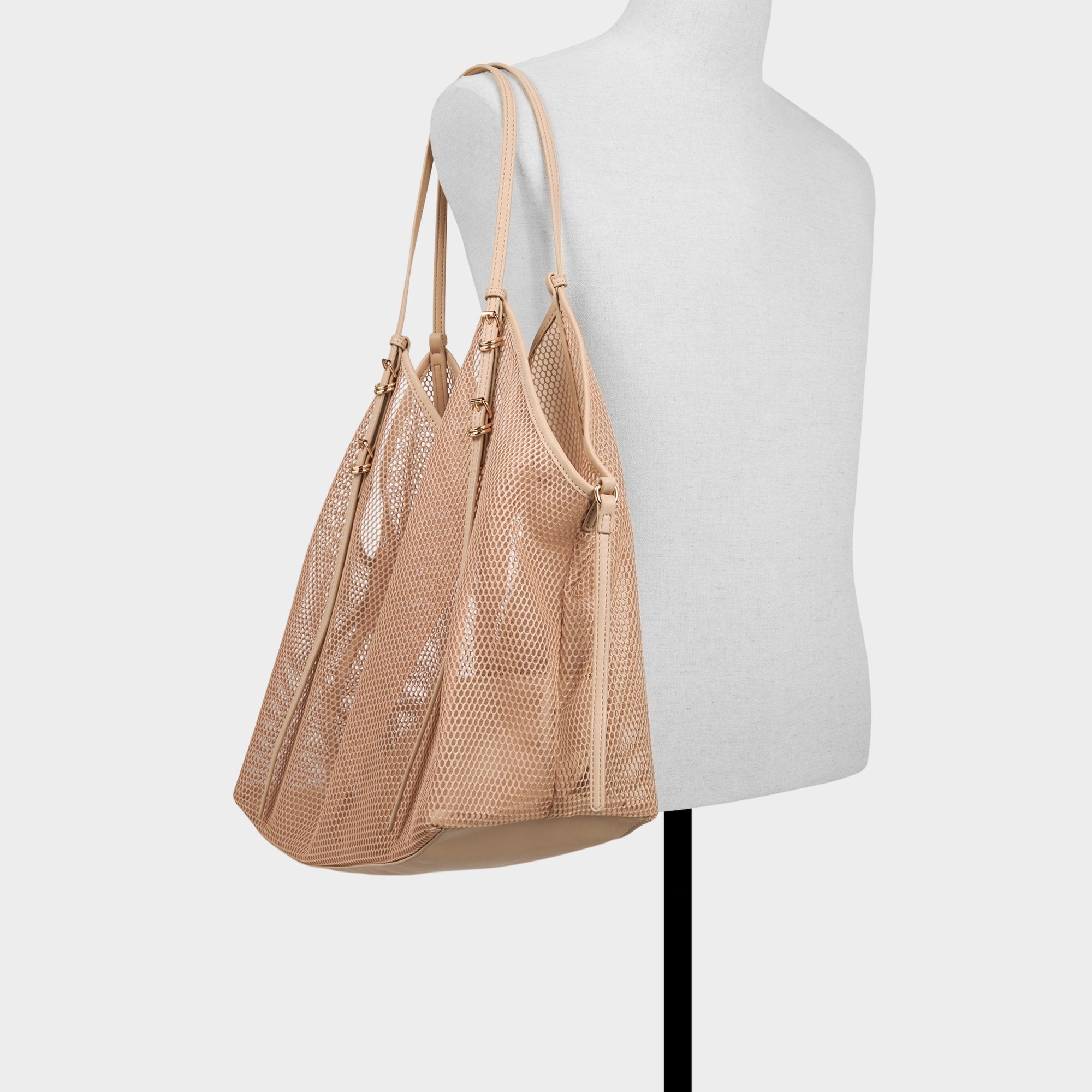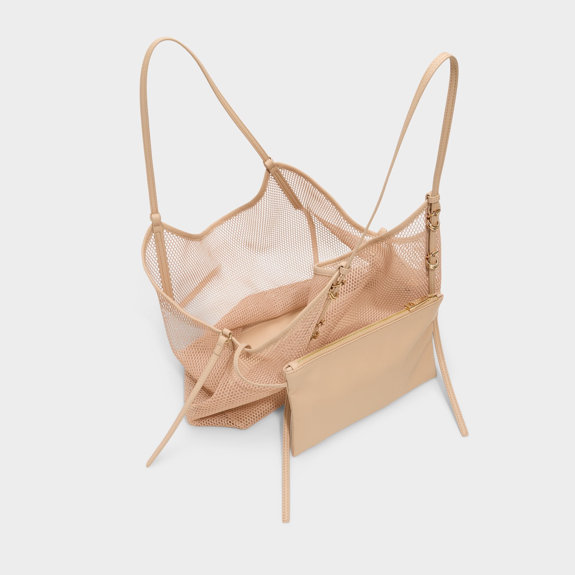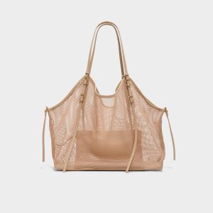 Airy mesh creates a slouchy tote that cinches with drawstring cords, offering space for beach blankets or market finds while gold hardware adds a subtle shine. Carry it with a breezy shirt dress on coastal walks or sling it beside gym leggings for quick city errands.