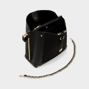 Braided leather handle crowns this sleek black bucket bag, its clean lines paired with a detachable curb-chain strap for effortless hands-free moments during commutes and cafe stops alike all season long. Carry it with a tailored trench for commutes, or sling it over satin slips for rooftop drinks.