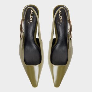 Olive patent glints along a sculpted kitten heel, and an adjustable gold buckle sharpens every step in this sleek slingback, turning city errands into a poised rhythm from morning meetings to after-work plans. Pair it with tailored trousers for presentations, or slip it under a sleek slip dress when cocktails tilt toward city-light strolling.