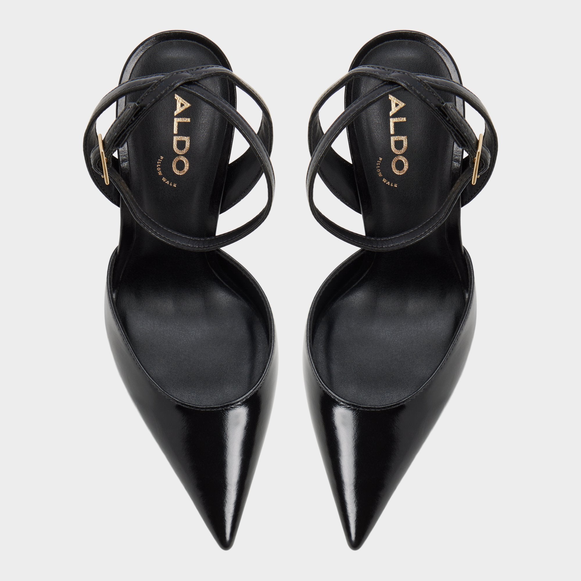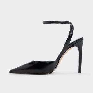 Sharper than a fresh idea, the glossy black leather pump frames every step with a sky-grazing stiletto heel, its delicate gold-buckle ankle strap locking in that after-dark confidence before you even speak. Team it with power suiting for pitch meetings or swap in a satin slip when candlelit dinners slide into rooftop dancing.