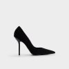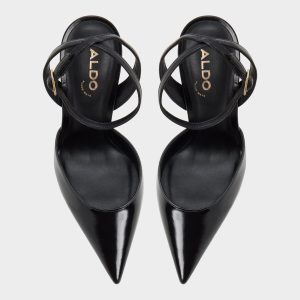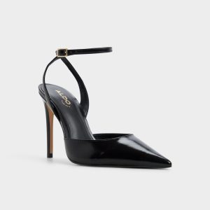 Sharper than a fresh idea, the glossy black leather pump frames every step with a sky-grazing stiletto heel, its delicate gold-buckle ankle strap locking in that after-dark confidence before you even speak. Team it with power suiting for pitch meetings or swap in a satin slip when candlelit dinners slide into rooftop dancing.