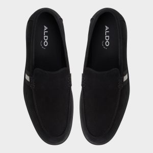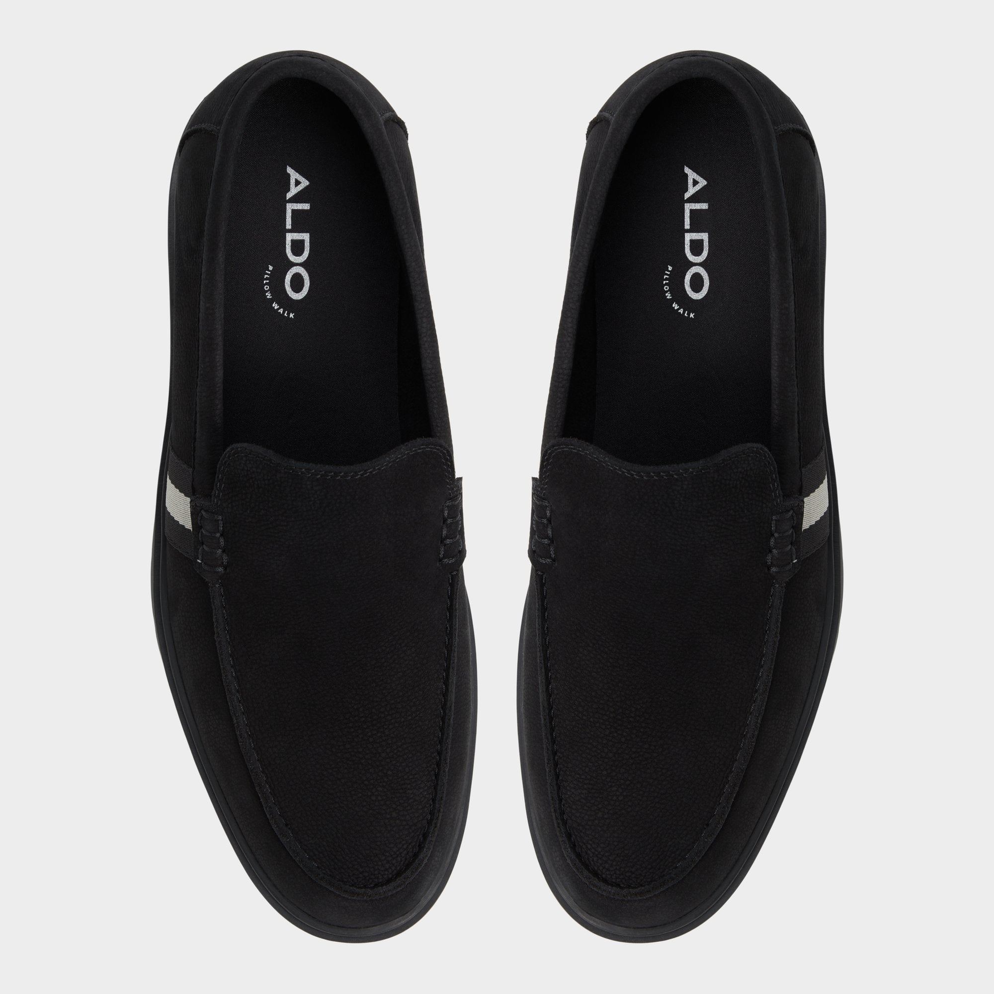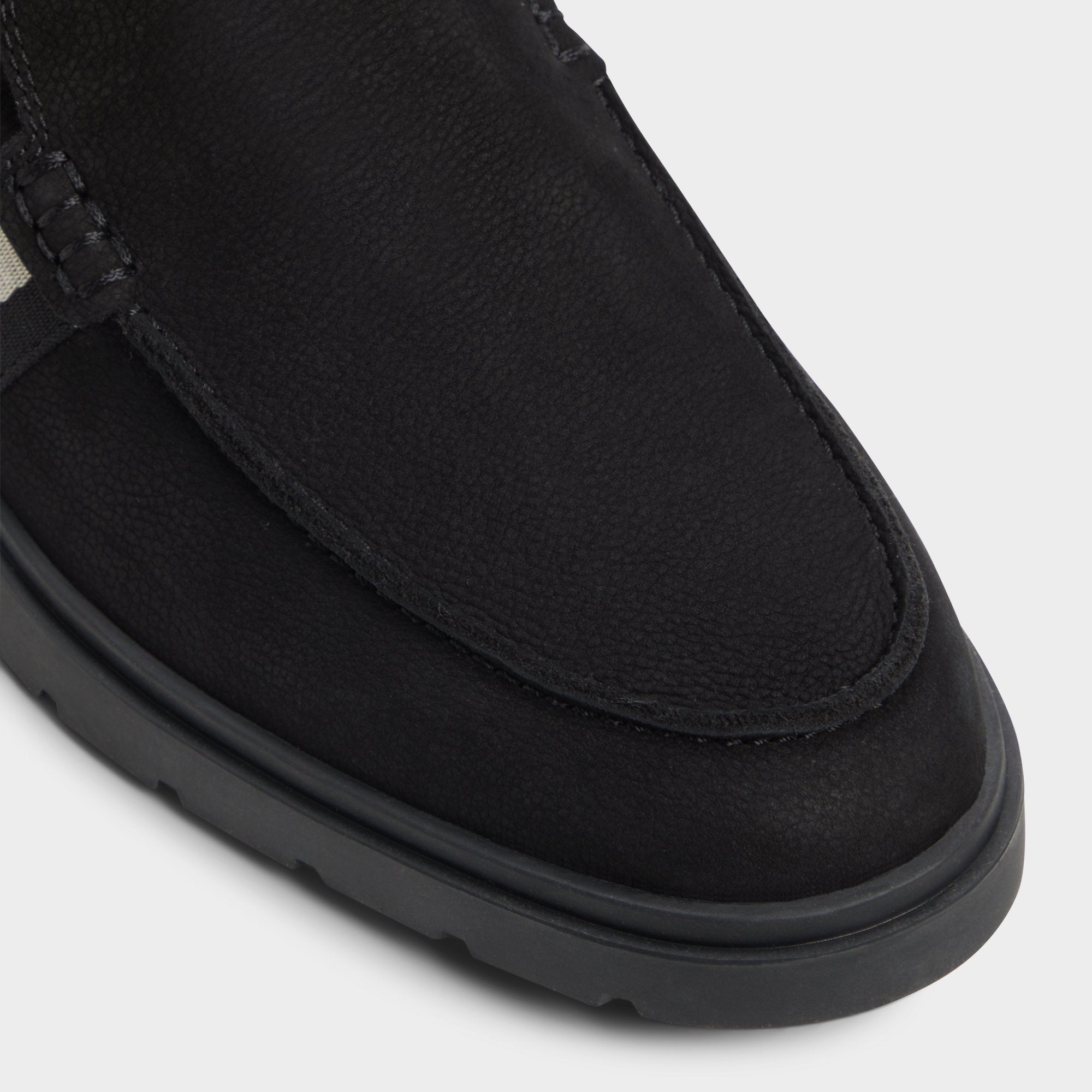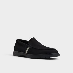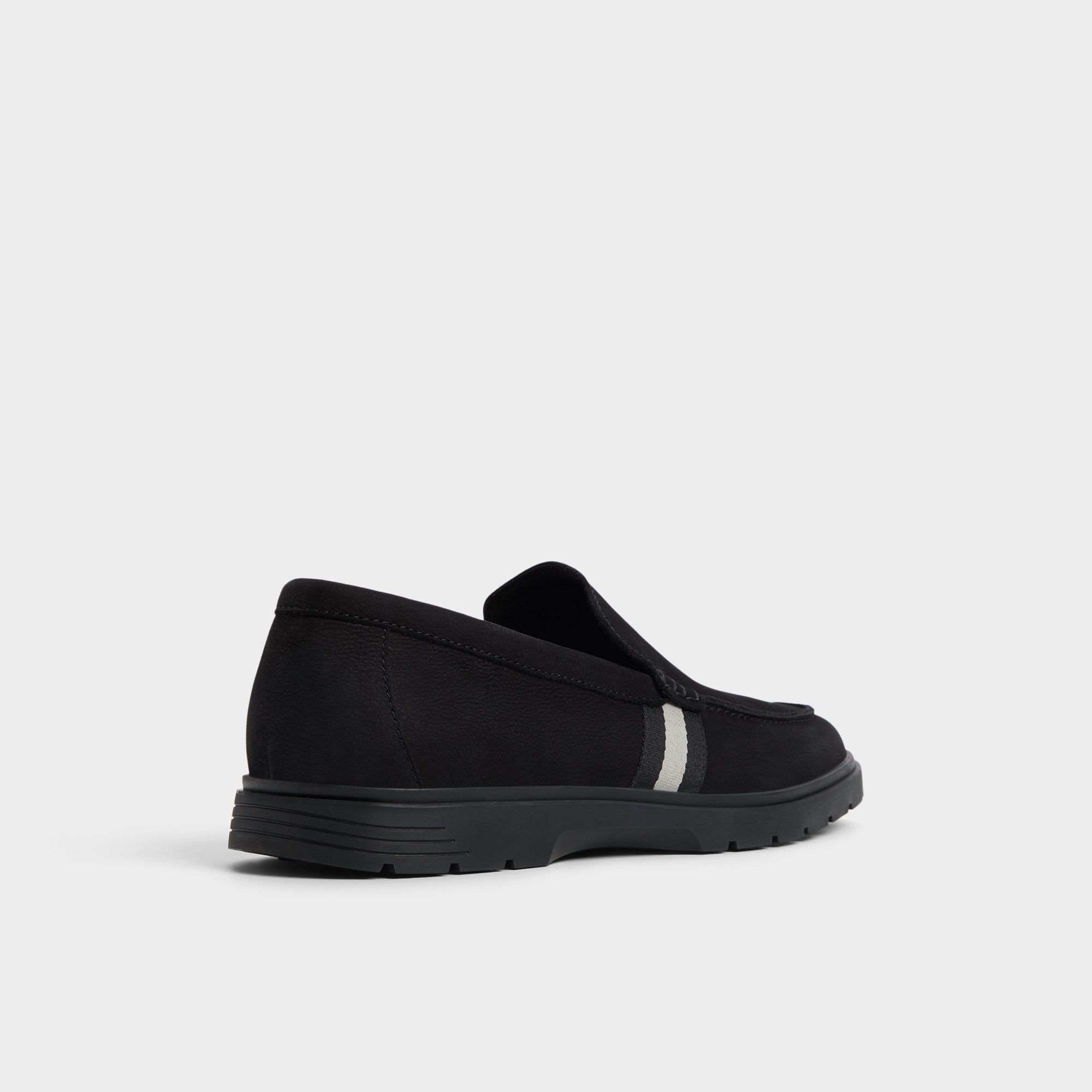 A stealthy grey side stripe breaks up the black textile upper while cushy lugged rubber soles deliver sneaker-level grip so you can dart from desk to drinks without second thoughts. Roll it with slim chinos for casual meetings or anchor faded denim shorts on seaside weekends-no socks required.