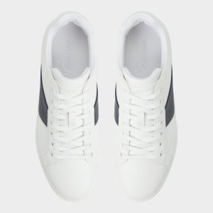 Navy panel cuts across smooth white synthetic leather, adding varsity energy, while metallic eyelets and a lightweight rubber sole keep these low-tops breathable from desk escapes to bar patios. Anchor slim chinos for brainstorm sessions or roll with faded denim on weekend brunch, the color-block stays sharp.