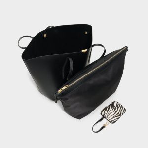Jet-black leather pairs with a removable zebra-print pouch, giving this roomy tote a bold everyday edge with streamlined shoulder straps and gold-triangle hardware. Carry it with a crisp blazer for office coffee runs, or sling it over weekend knits and leggings to pull everything together.