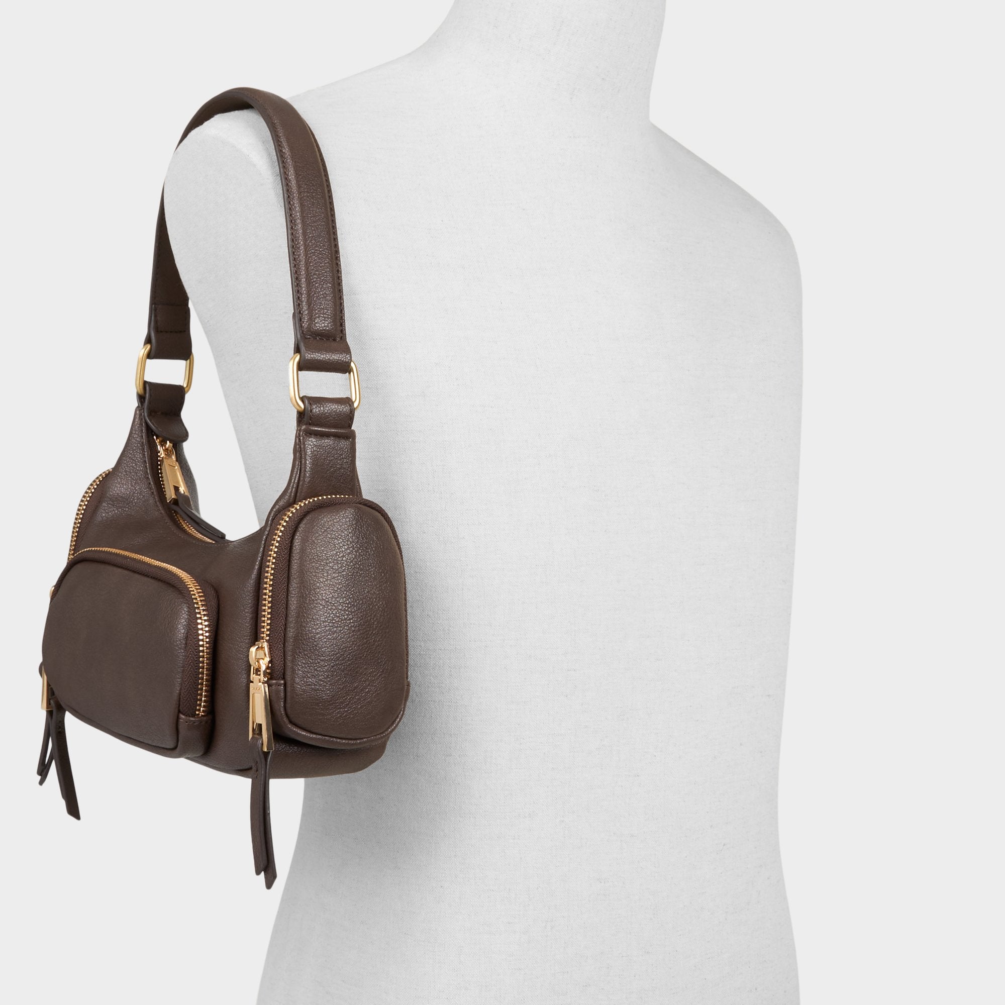 Buttery brown leather meets gleaming gold zips on this streamlined shoulder bag, while a trio of exterior pockets—front patch plus twin side compartments—keeps keys, earbuds, and lip balm within easy reach. Sling it over a trench for brisk coffee runs, or tuck it against a sleek midi for a night-out look that finishes every outfit with quiet confidence.