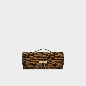 Fierce tiger-print calf hair envelops this structured clutch in untamed energy, anchored by gold lock and chain detail that adds runway attitude to its slim silhouette. Clutch it with a satin slip for rooftop cocktails or carry by the handle with high-rise jeans on gallery strolls.