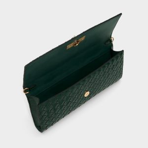 Glossy woven leather captures city lights like wet cobblestones, with a gleaming turn-lock and a petite chain sealing this compact top-handle clutch for long nights. Carry it with silk slips to rooftop drinks, or tuck it beside sharp suiting at gallery openings to finish every look with a touch of gold.