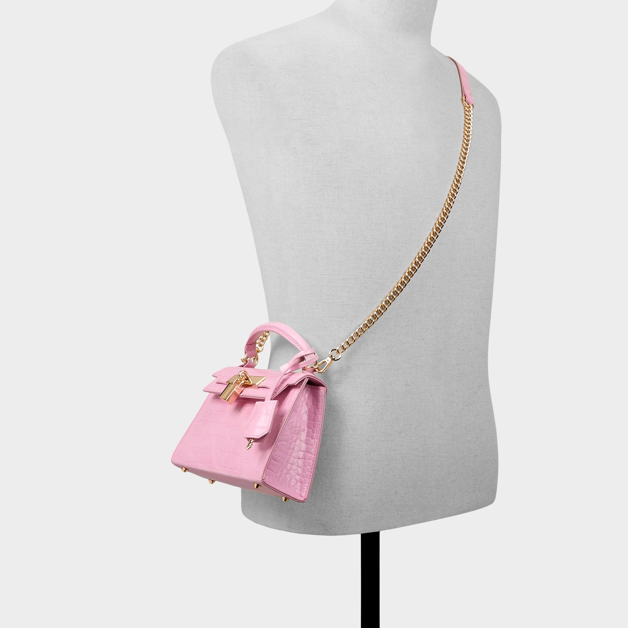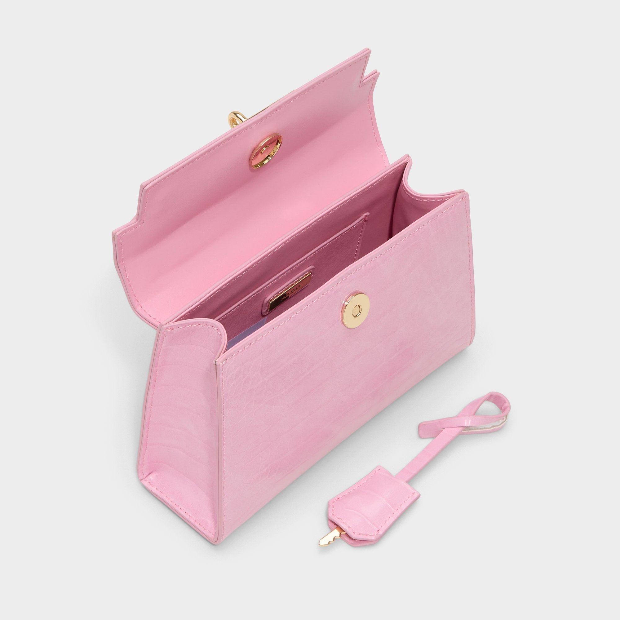 Glossy bubble-gum croc patent meets sculptural lines in a petite top-handle, with a bold gold padlock anchoring the front flap for instant party-clutch charisma that blends power-satchel confidence and party-clutch playfulness. Carry it with tailored blazers for interviews or sling it over floral minis after dark, finishing looks in candy hues.