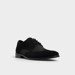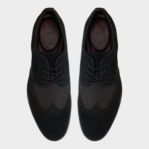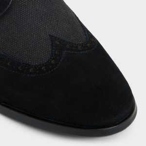 Suede wingtip overlays meet fabric quarters on this black Oxford, the contrast heightened by subtle punched brogue detailing and almond-toe lines that stay sharp yet relaxed through day-long wear. Pair it with charcoal tailoring for client meetings, or roll with dark denim on a weekend date night, and let the finish do the talking.