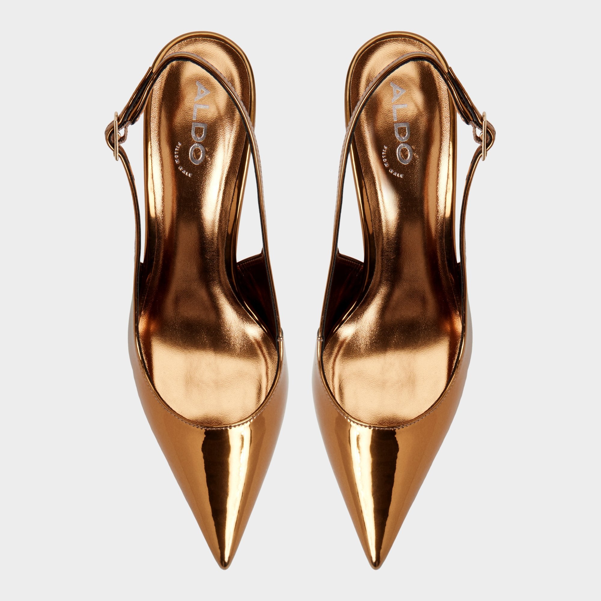 Molten metallic leather covers this razor-sharp point-toe slingback, pairing a slim stiletto with an adjustable buckle to give your stride edge as neon lights sweep every confident step through the city. Pair with sleek suiting for presentation mornings, or swap in a satin mini for nights out.