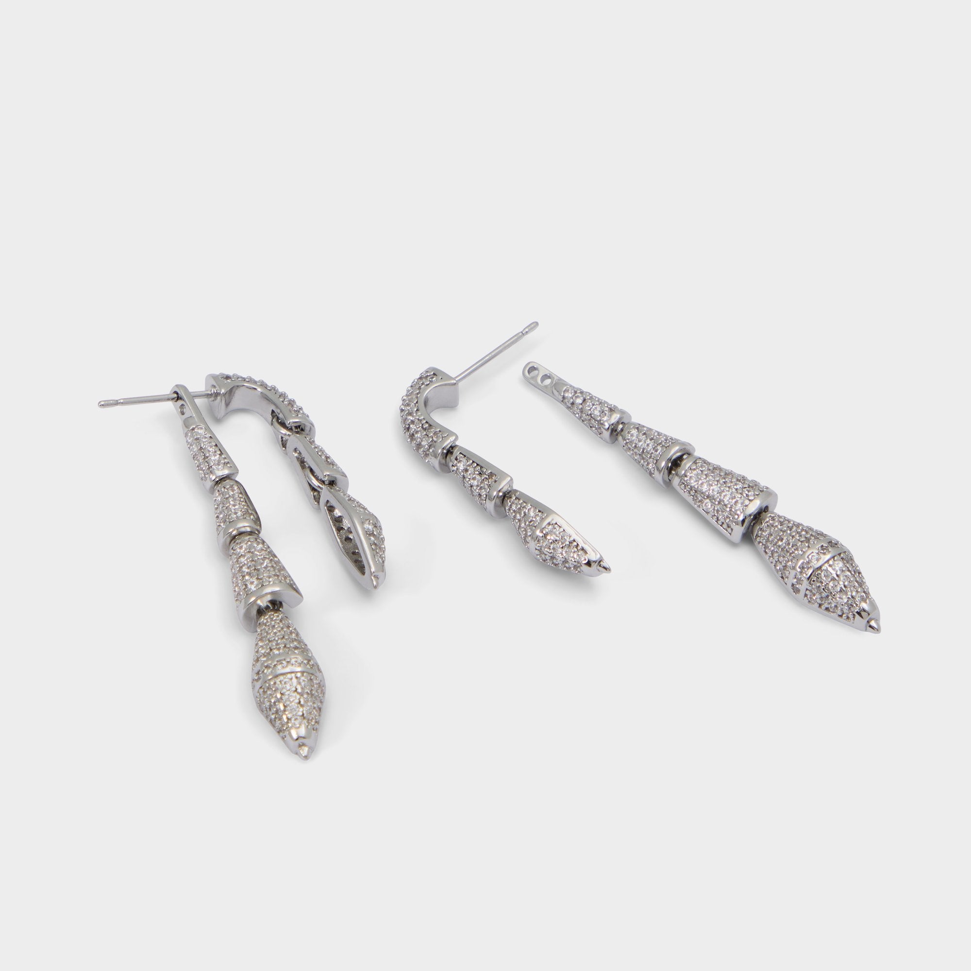 Articulated serpent links shimmer across drop earrings, each joint set with pave crystals that flex to catch light and deliver head-turning refinement from every turn of the evening. Frame them with a satin slip for rooftop nights or stack with a denim jacket and tee for city-stroll days.