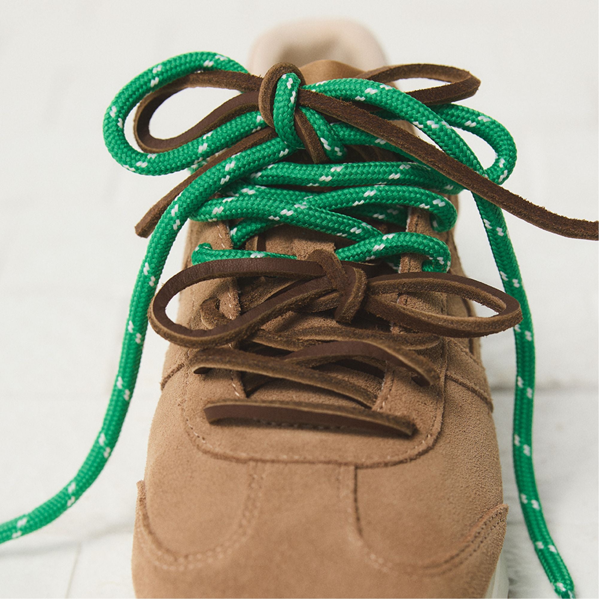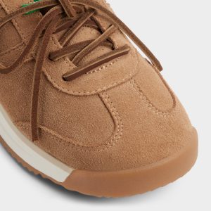 Soft suede meets retro jogger sole in low-profile sneaker swapping standard laces playfully-earthy brown & fresh green-for low-key spontaneity shouts each step feels like detours calling out! Cropped cargos weekend markets ground satin skirts study breaks photo walks!