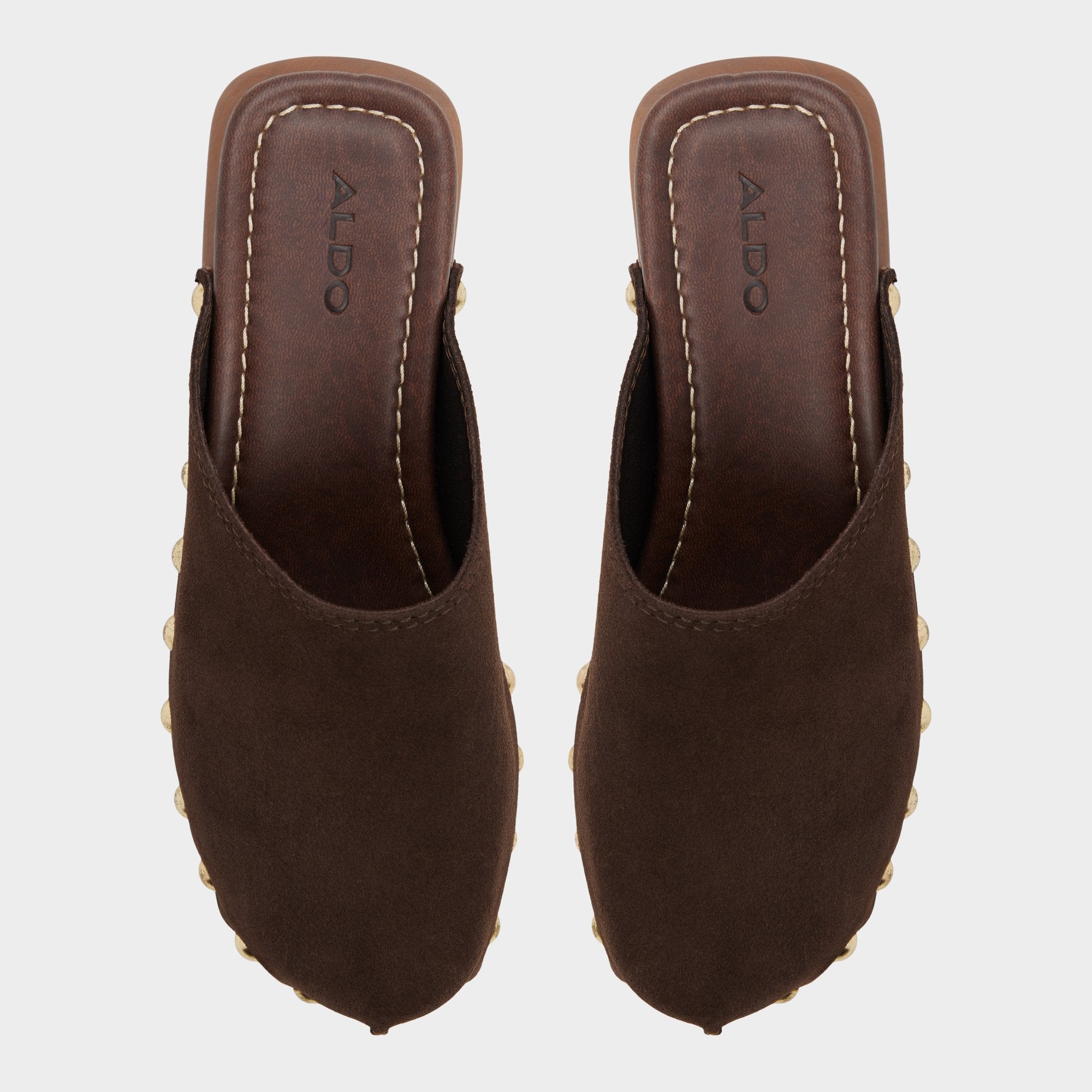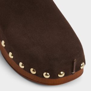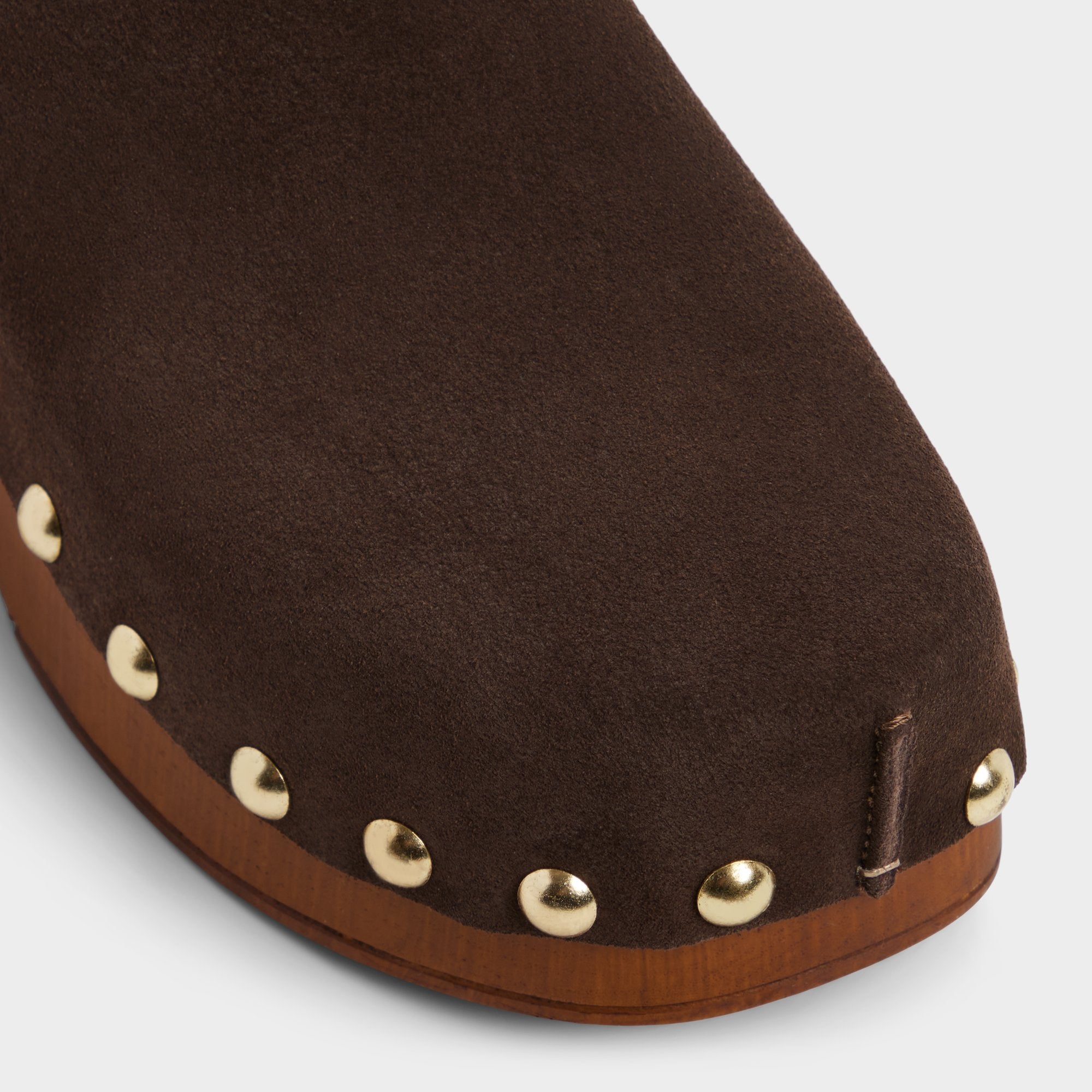 Glossy gold studs trace the edge of a wood clog heel, pairing rich suede with cushioned insoles to create an easy-slide attitude that’s confident from morning errands to after-hours gallery hops. Pair with flared denim for market mornings, or anchor satin midis when gallery openings roll into wine-bar afterhours.