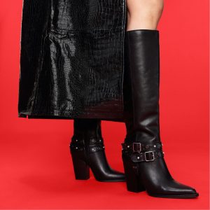 The buckle detailing of these pointed toe, western-inspired knee-high boots adds just that extra touch of edge you were looking for.